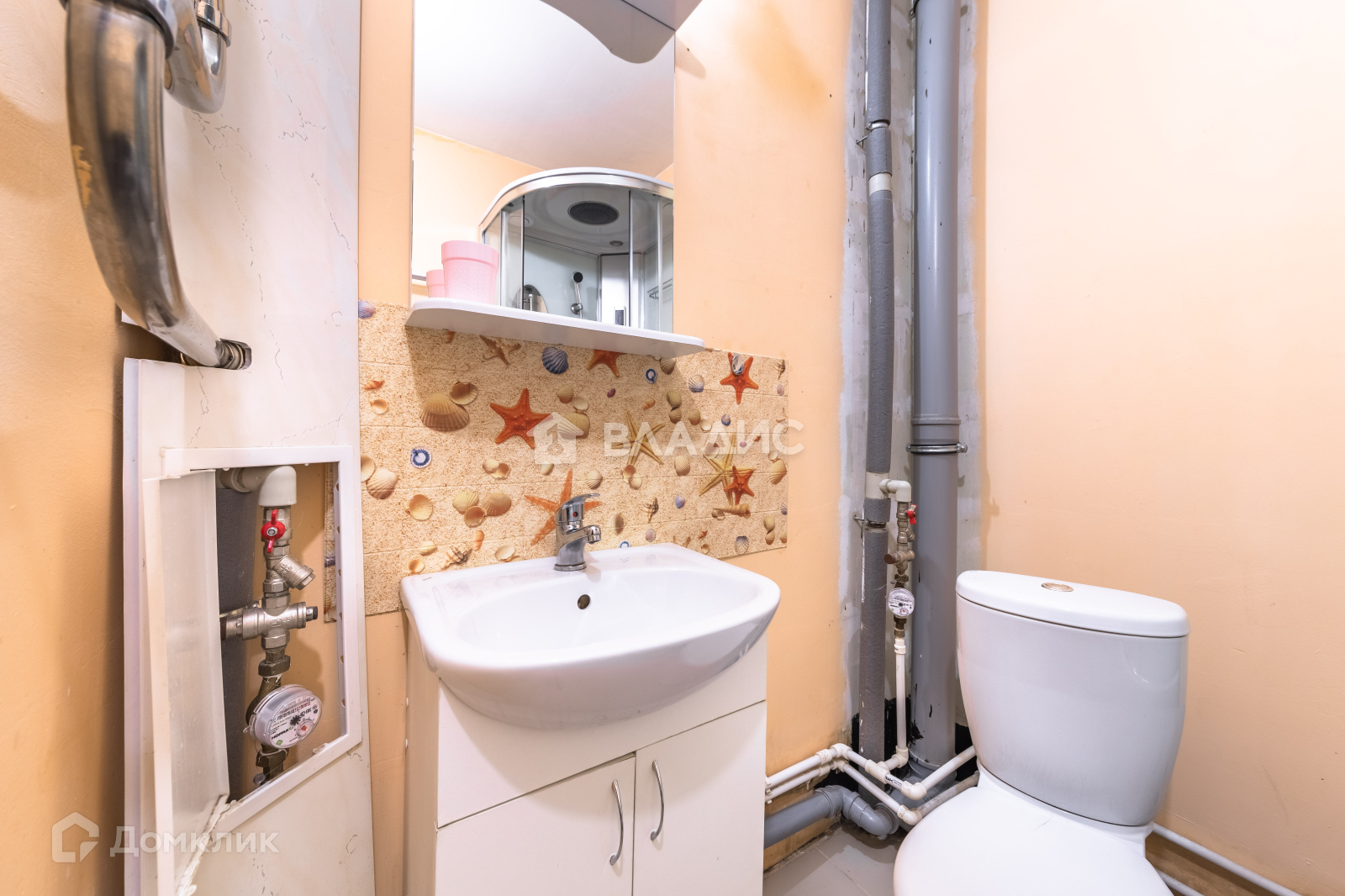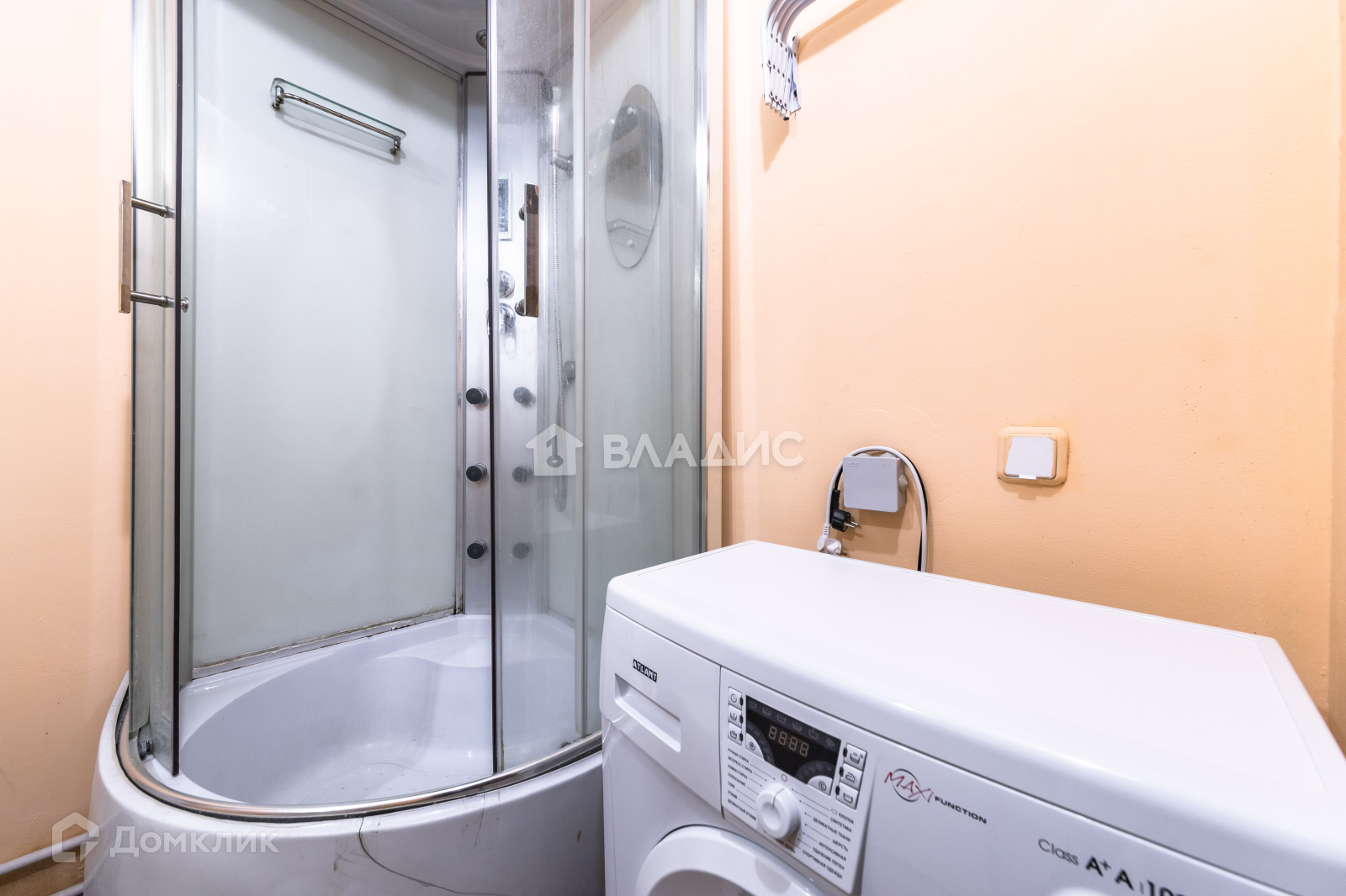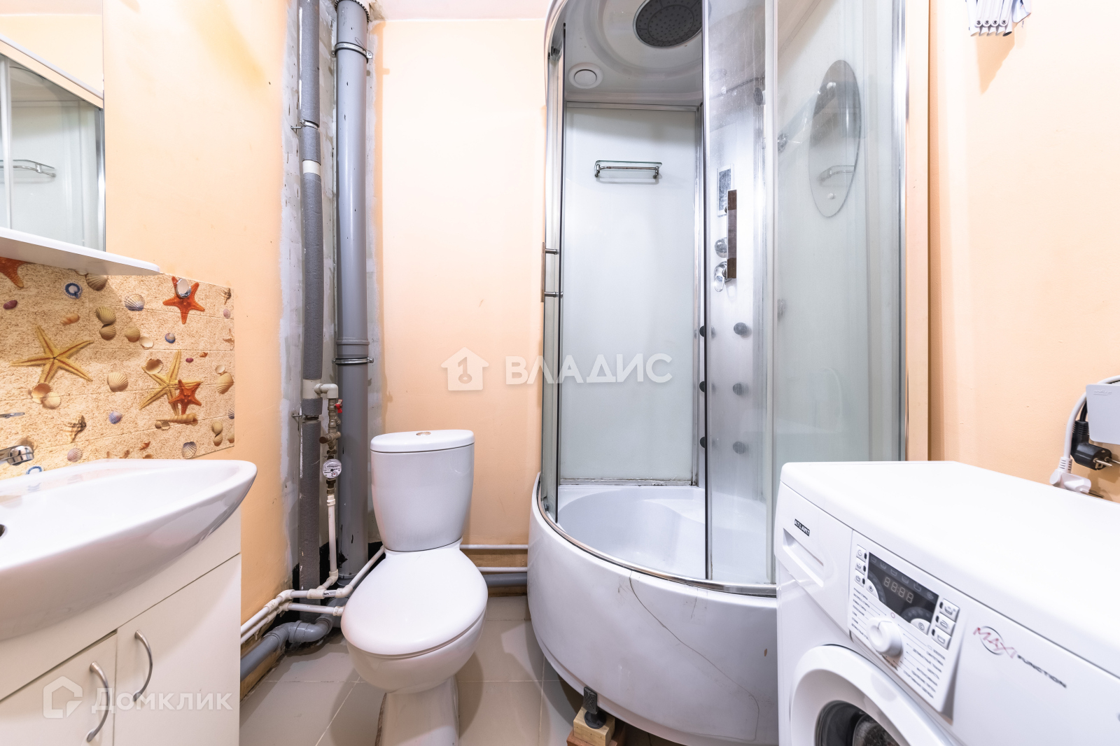 В ванной душевая кабина, стиральная машинка Атлант, раковина с тумбой и навесной шкаф с зеркалом и подсветкой.