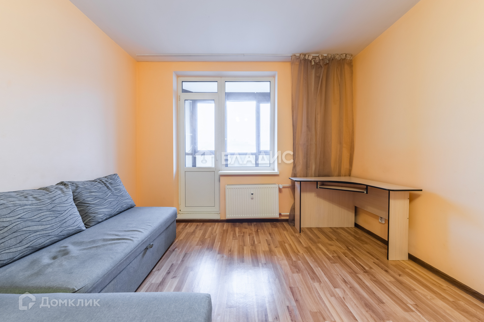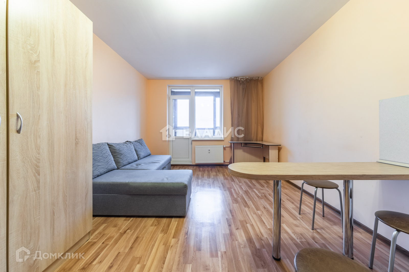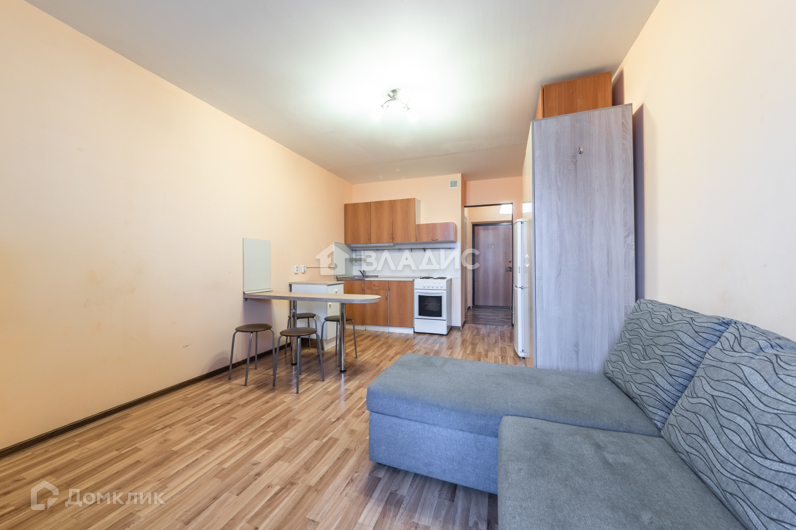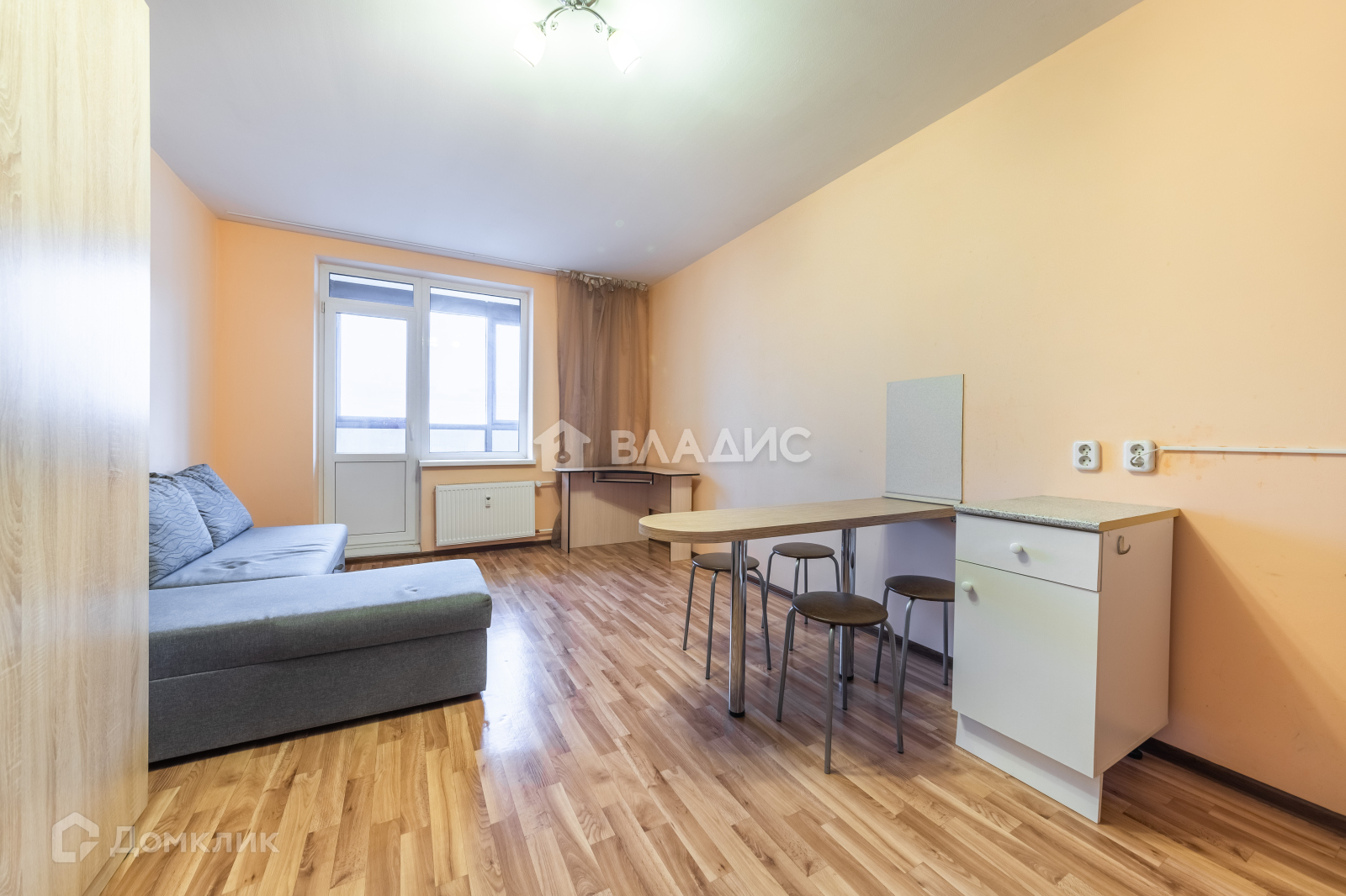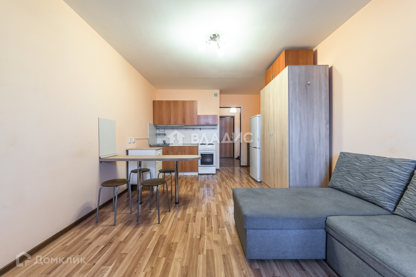 Установлен кухонный гарнитур со всей необходимой бытовой техникой, электроплитой, барная столешница, холодильник. В комнате большой шкаф для хранения, угловой диван со спальным местом 200 на 150. Также имеется рабочее место, письменный стол у окна и вместительный комод с 4 выдвижными ящиками(1 м ширина).