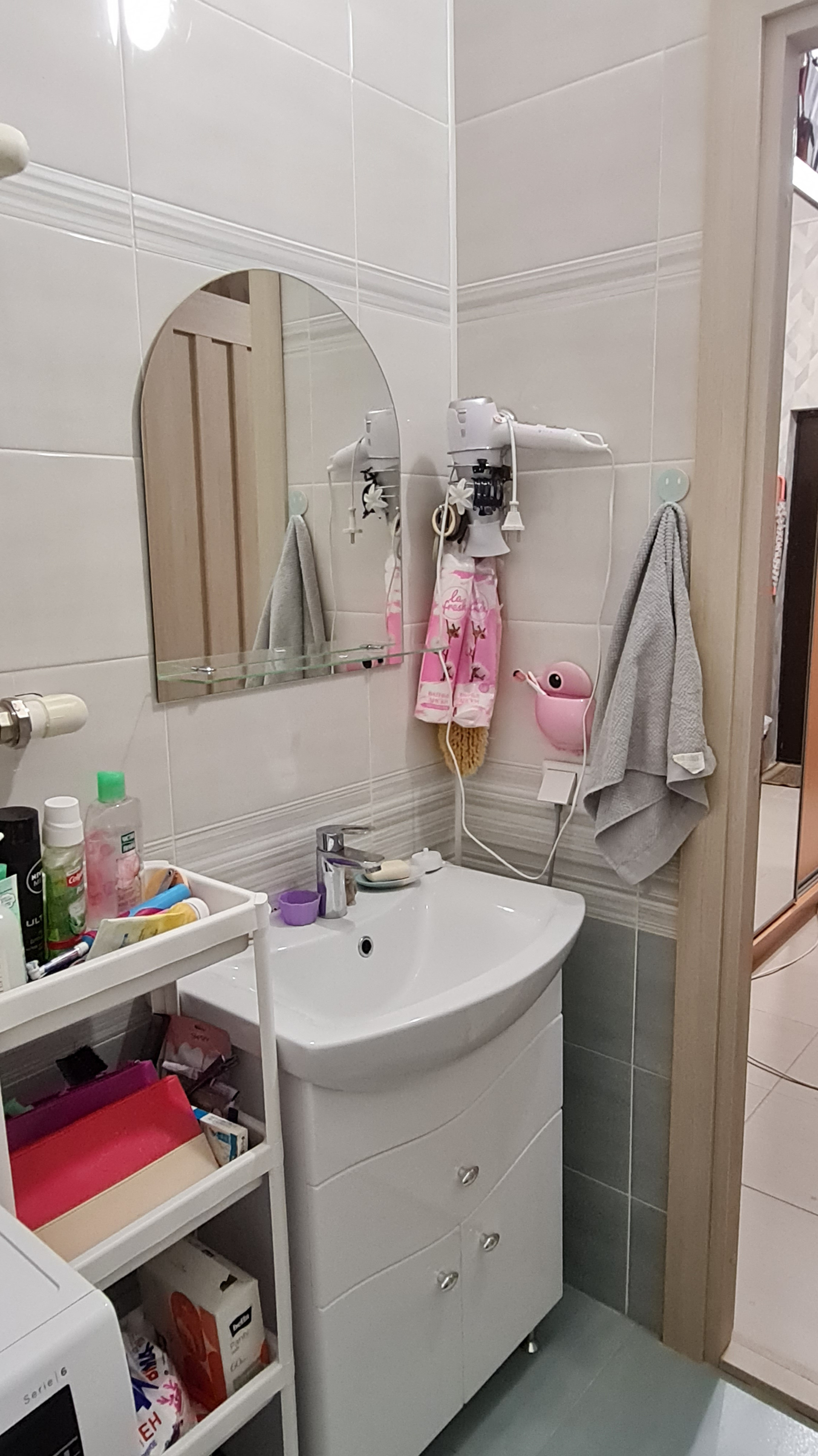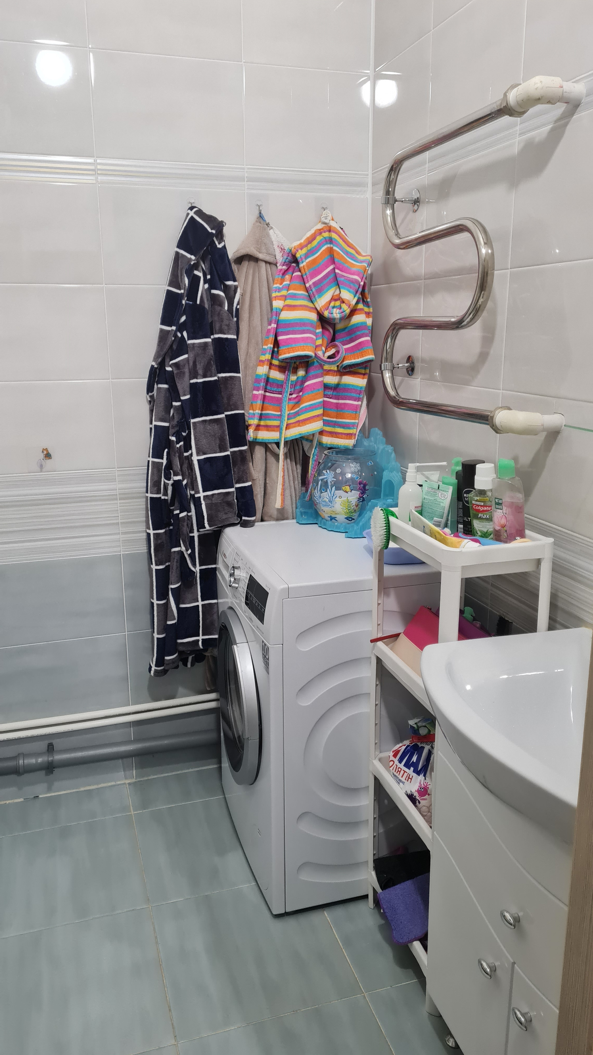 Санузел раздельный; просторный холл, где помещаются огромный шкаф для одежды и шкаф для хранения инструментов и бытовых мелочей - на фото не видно, покажу при просмотре. Есть возможность также отделить кладовку. В санузле тоже за шторой помещается стеллаж для хранения.
