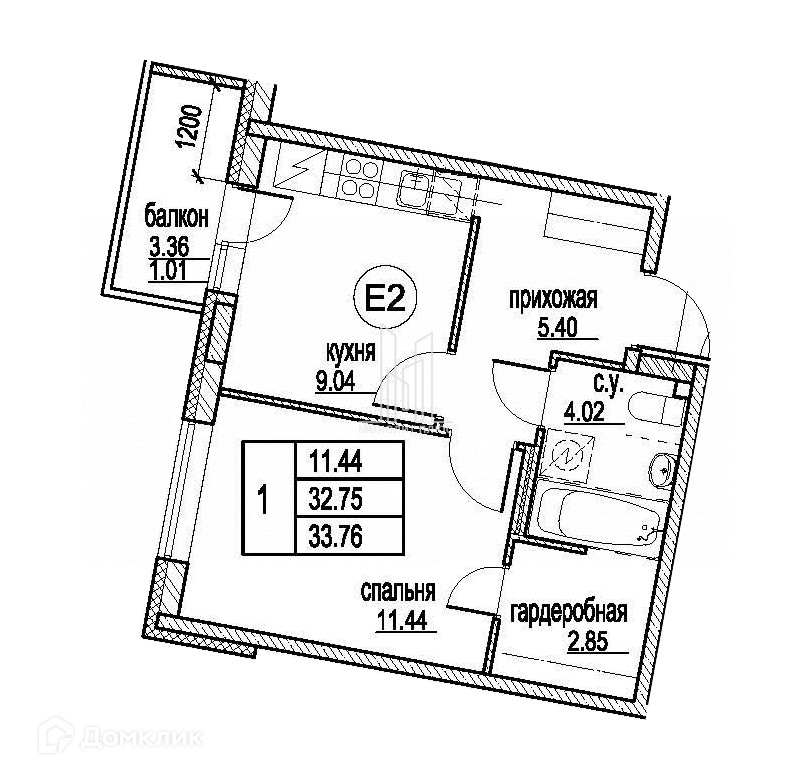 Общая площадь 33.76 м2