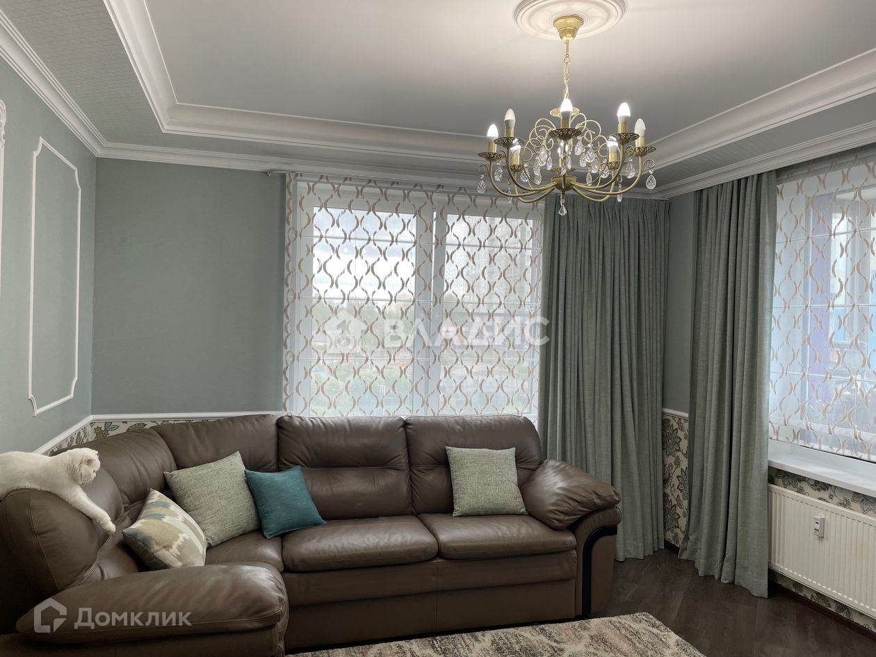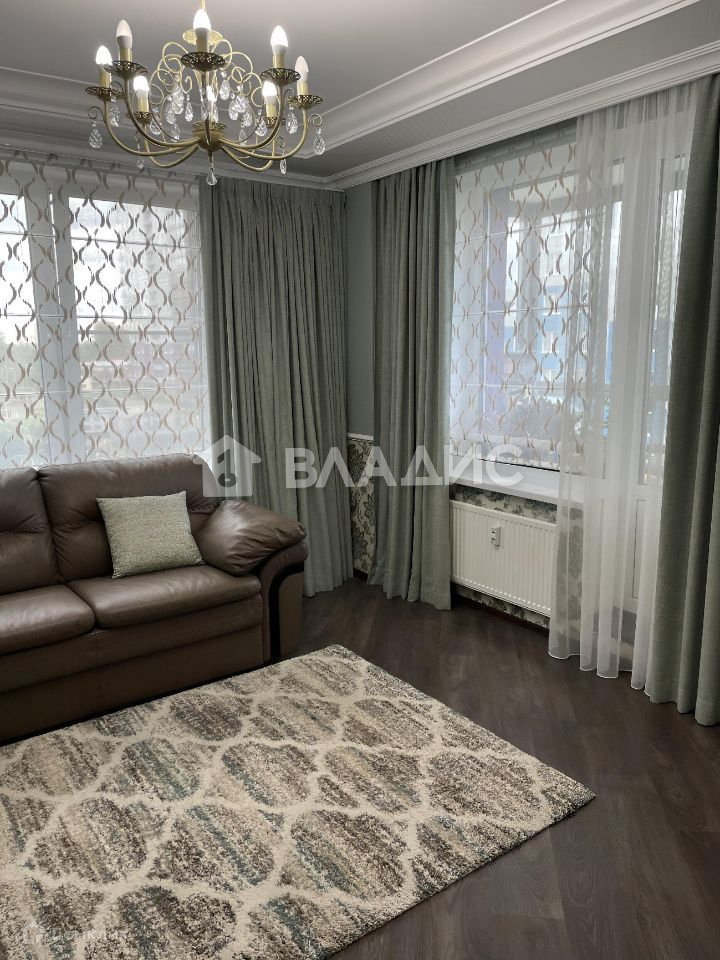 В гостиной большой кожаный диван-кровать - производитель Формула дивана, шкаф и ТВ тумба выполнены из массива дерева. Дорогой, качественный текстиль на окнах во всей квартире.