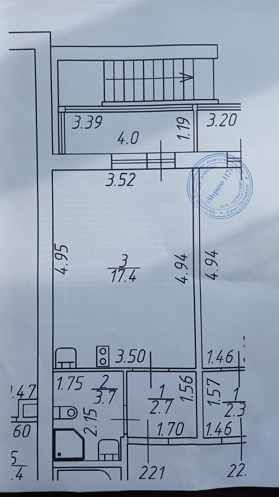 Лоджия 4 кв. м (ширина 1,19 м на 3,39 м)