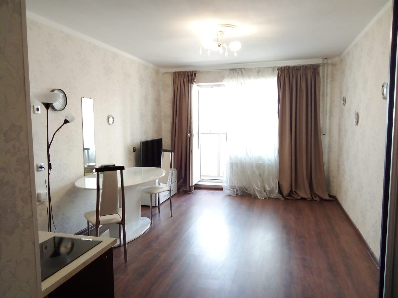 В квартире остается современный кухонный гарнитур с индукционной плитой. Шкаф, телевизор, стиральная машина и дорогой стеклянный стол сот стульями.