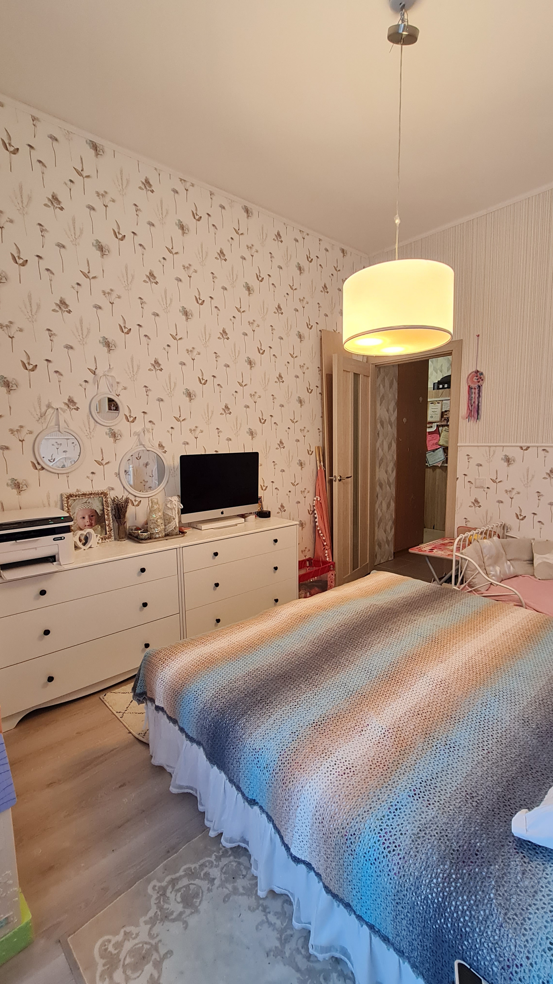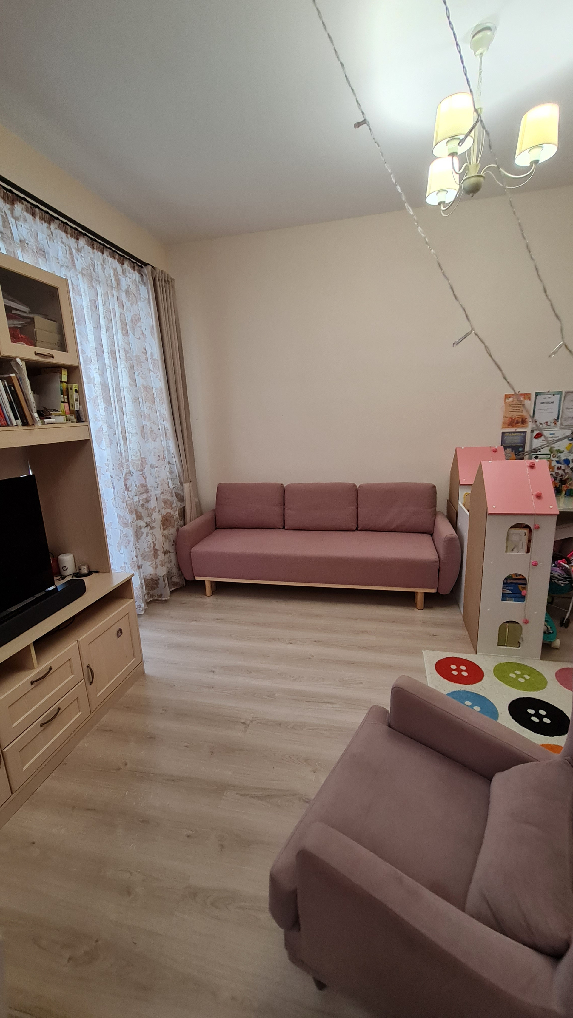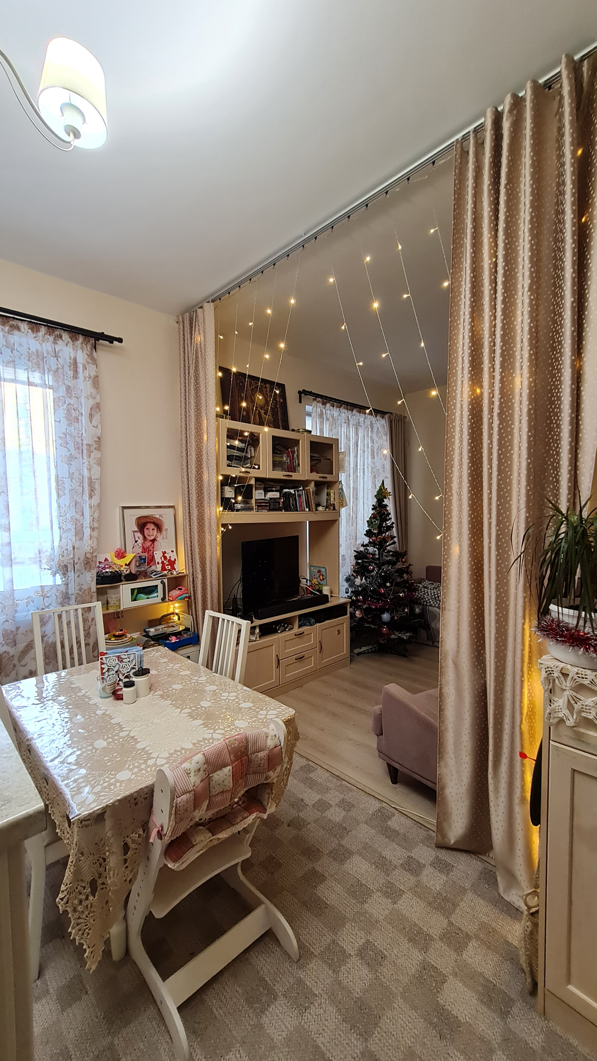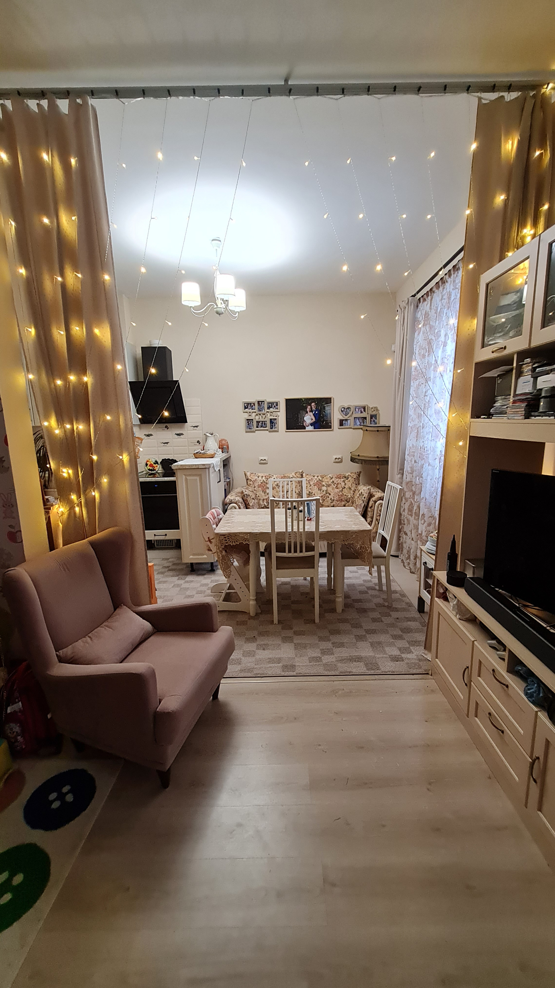 Перепланировок не было - такой продавалась от застройщика. Преимущество - большое общее помещение кухни и гостиной. Спокойно принимаем компании друзей и даже устраиваем детские праздники - все помещаются. При желании можно сделать перегородку или раздвижные двери. Т.к. помещение гостиной имеет отдельный вход.