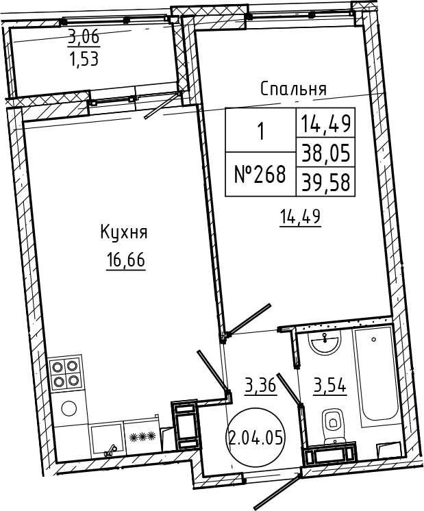 Общая площадь 39.58 м2