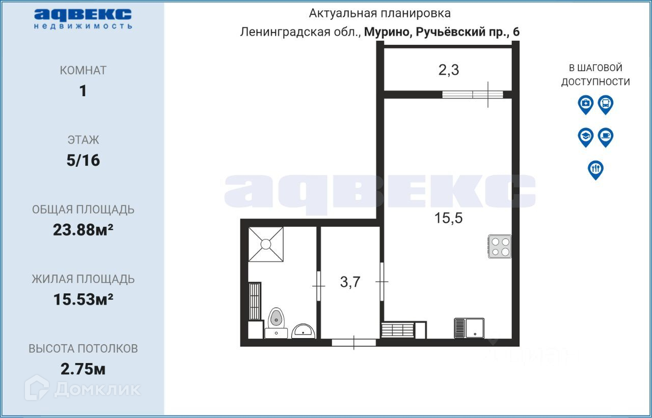 Квартира студия, 23.88 м2, этаж 5 / 21, на продажу в Мурино, Ручьёвский проспект, 6