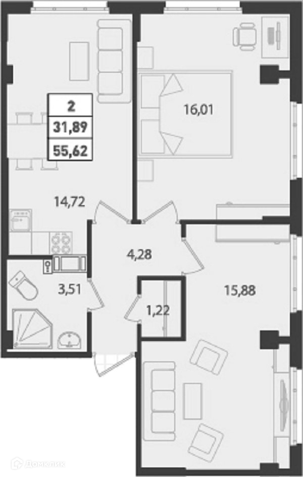 Общая площадь 55.6 м2