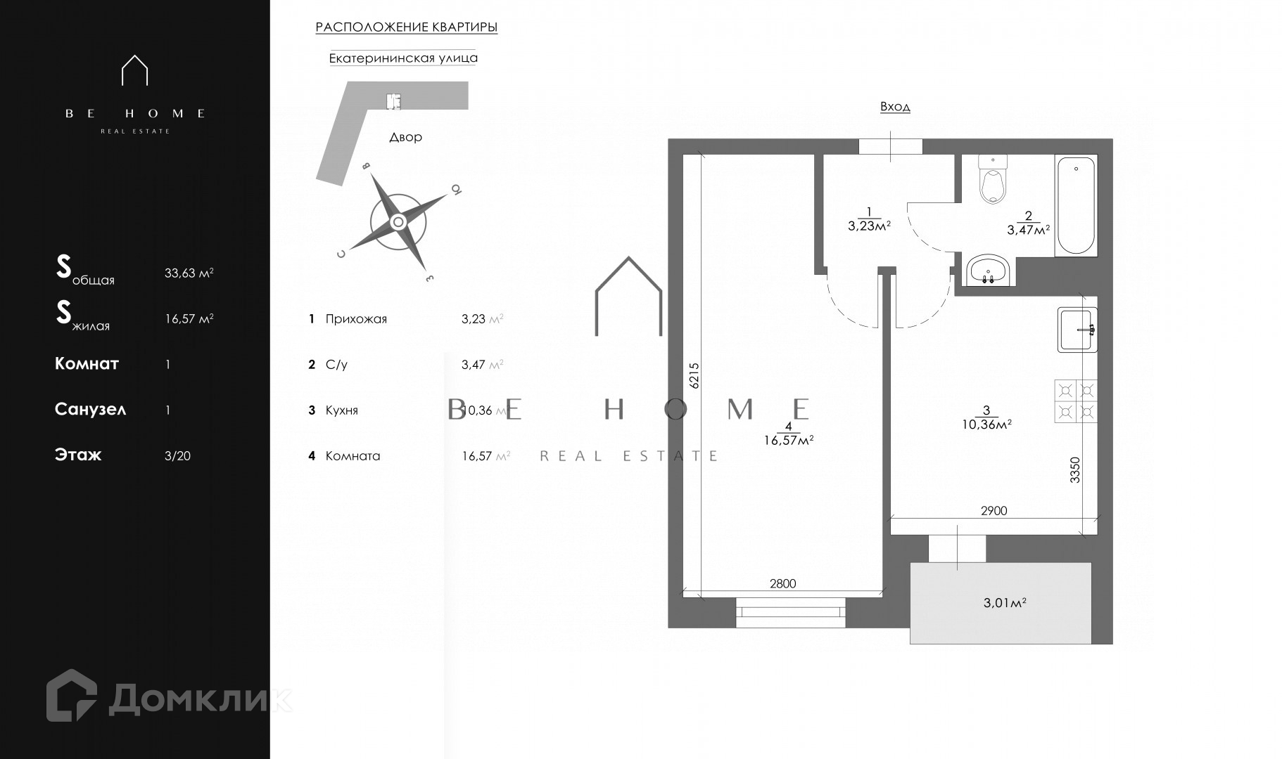 Общая площадь 33.5 м2