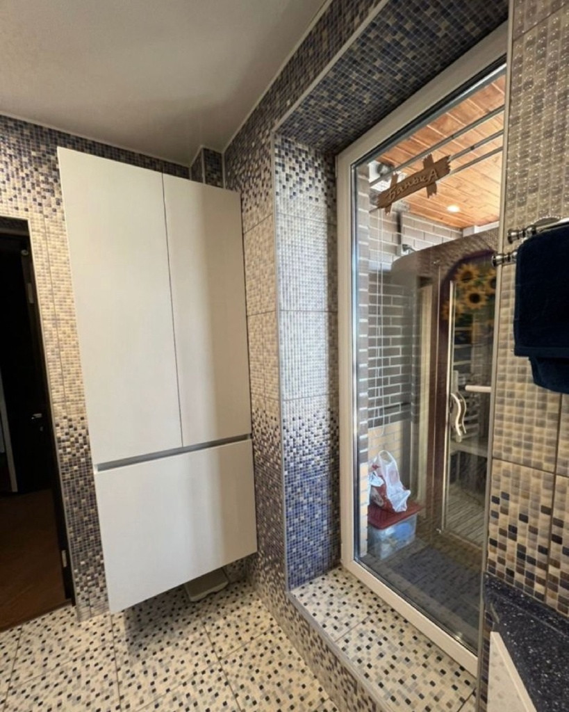 Ванная комната-5,32 кв.м. + лоджия с панорамным видом-4,8 кв.м.(утеплённая),установленная инфракрасная сауна(Алтайский кедр).На балконе установлена сушилка для одежды. Очень удобная и практичная, одежда сохнет очень быстро. Встроенный шкаф в ванной комнате и тумба под раковиной.
