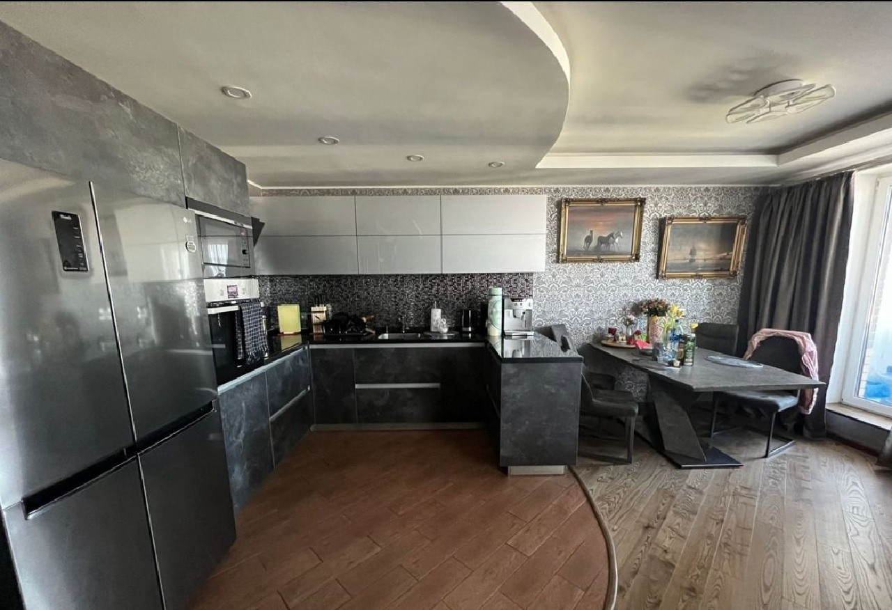 Просторная кухня + гостиная + балкон 4,87 кв.м. (утепленный ,с теплым полом) кухонный гарнитур ,производство Германия со встроенной техникой, кондиционер Samsung.