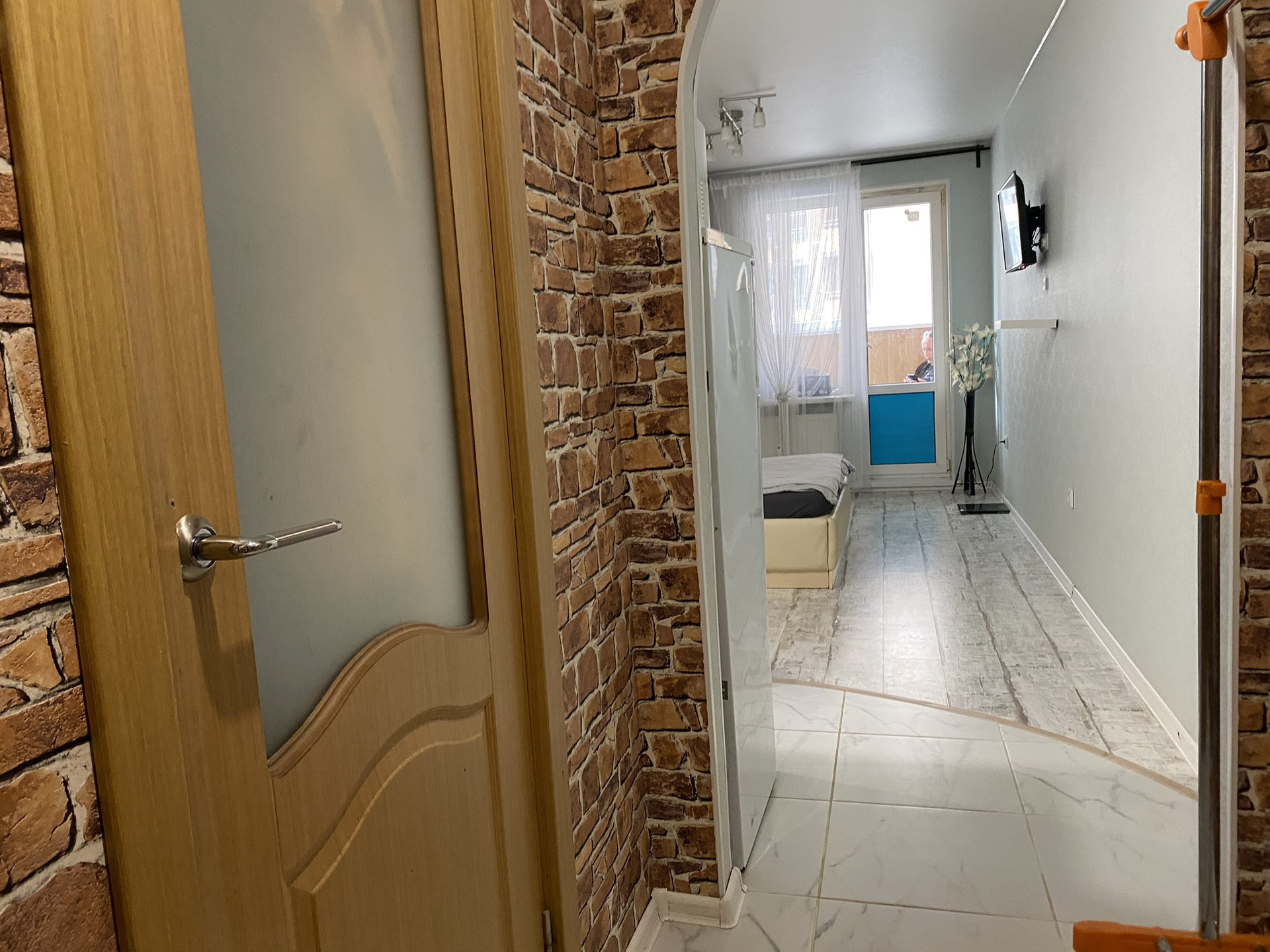 - Просторная комната (18,1кв.м) с выделенной кухонной зоной. Совмещённый санузел.