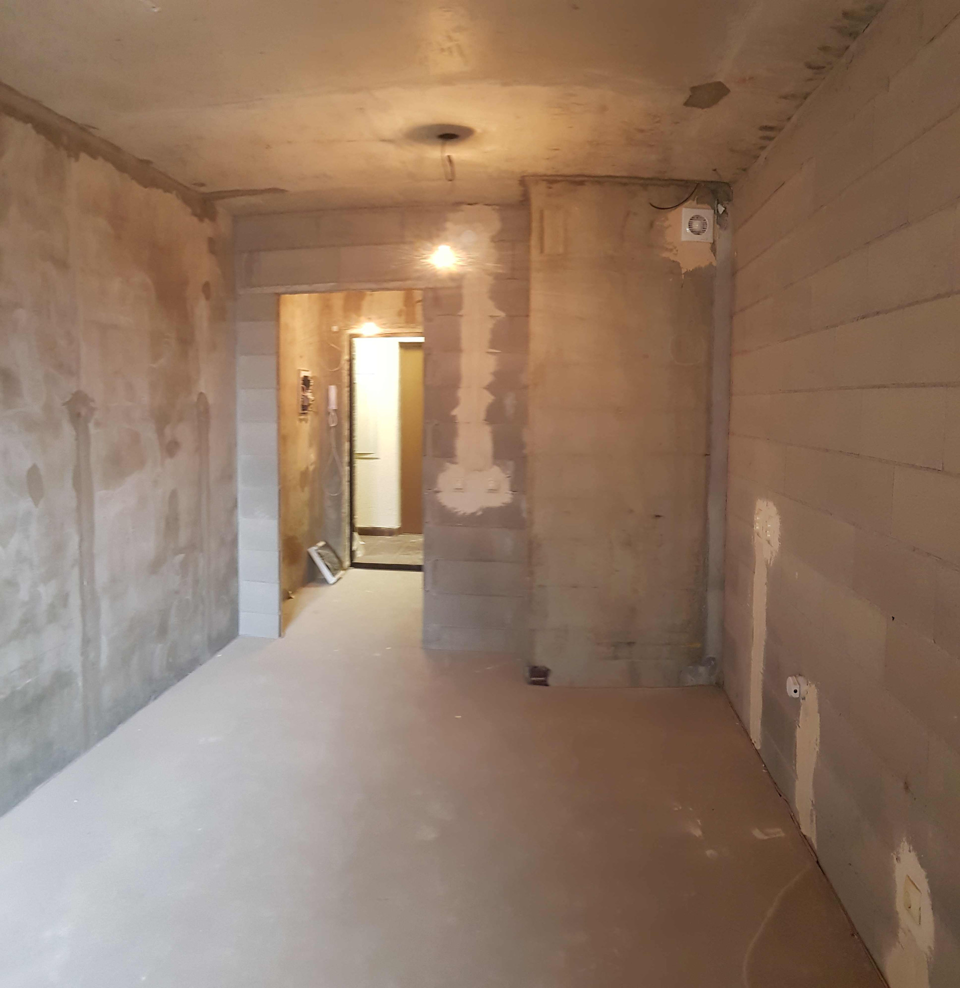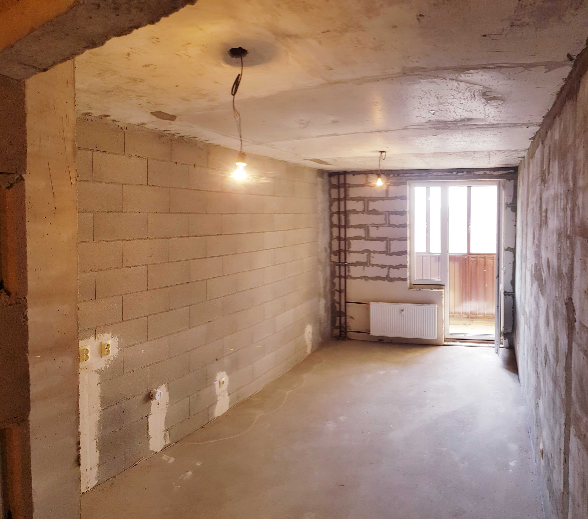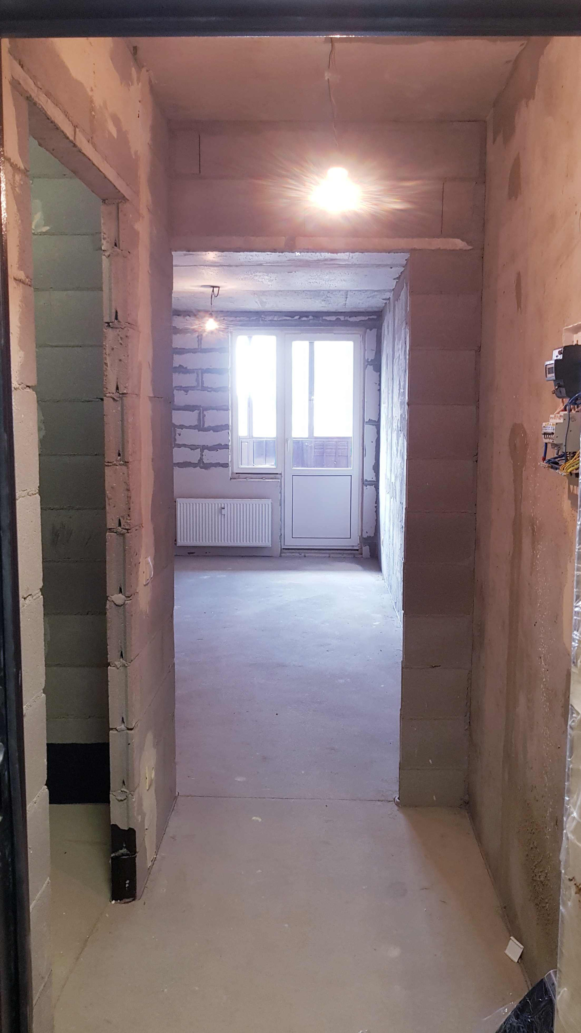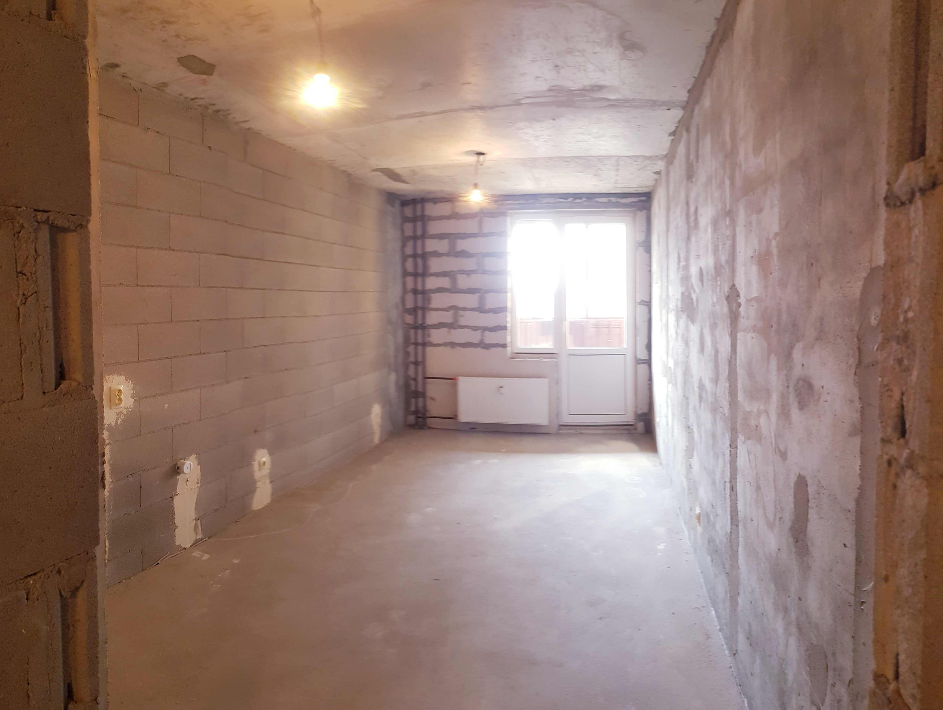 Комгата правильной прямоугольной формы, лоджия широкая удобная, выполнена стяжка, выровнены стены и потолок.