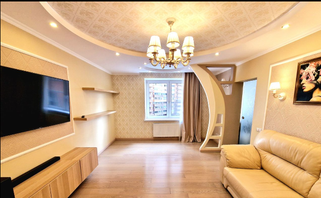 Ремонт сделан в светлых, успокаивающих тонах. Везде декоративные потолки с подсветкой и утопленными в глубь карнизами. Высота потолков 2,5 метра. Уложен дорогой керамогранит ( с подогревом) в коридоре, кухне, балконе, ванной и туалете. В квартире тепло, тихо.