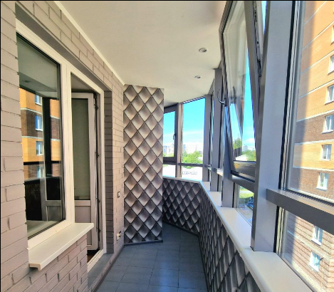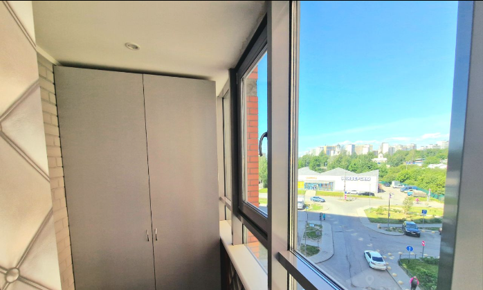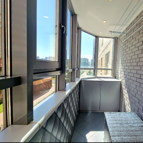 Большой балкон 7 кв.м. с теплыми полами, удобной зональностью и установленной по заказу мебелью для хранения разных бытовых вещей.