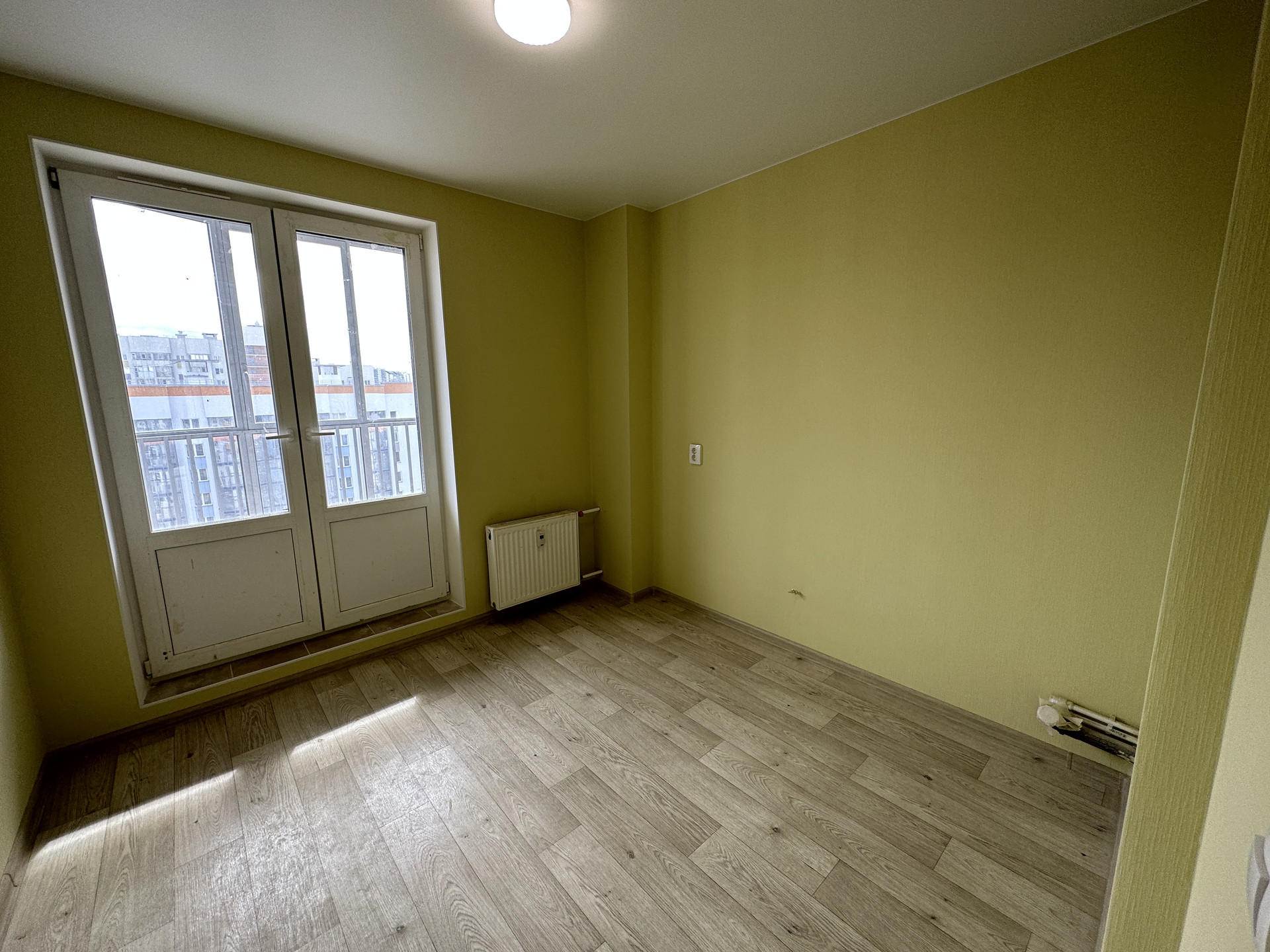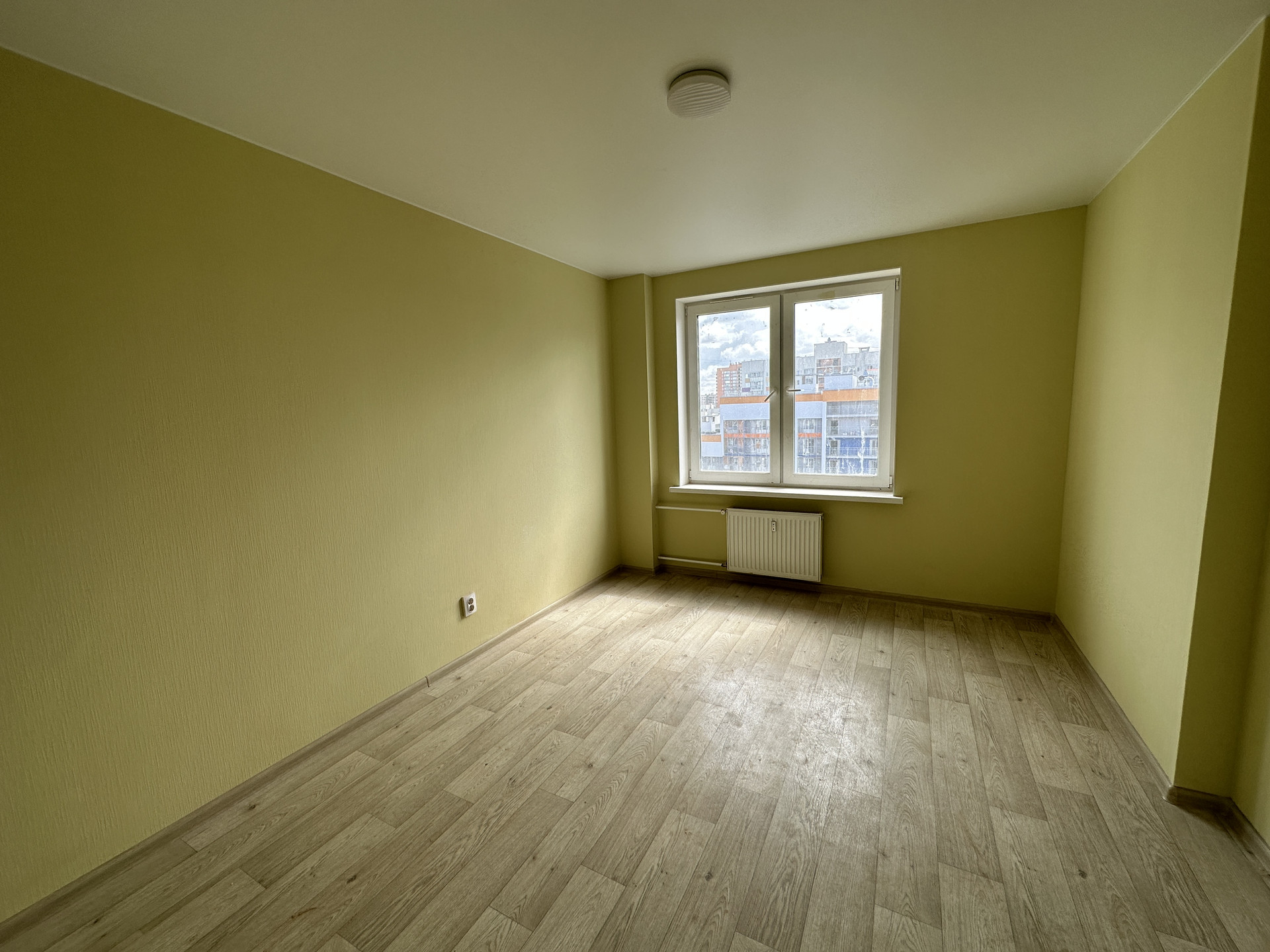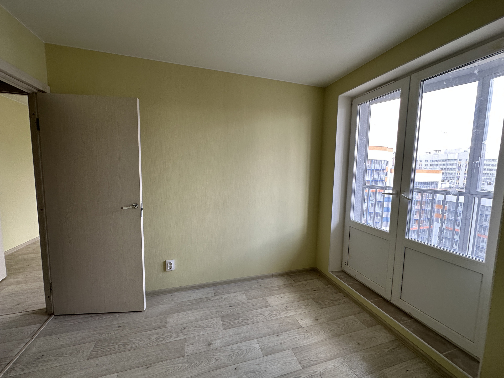 Ремонт выдержан в светлых тонах. Стены оклеены обоями, на полу - ламинат, в санузле на полу кафельная плитка, установлена сантехника, межкомнатные двери.