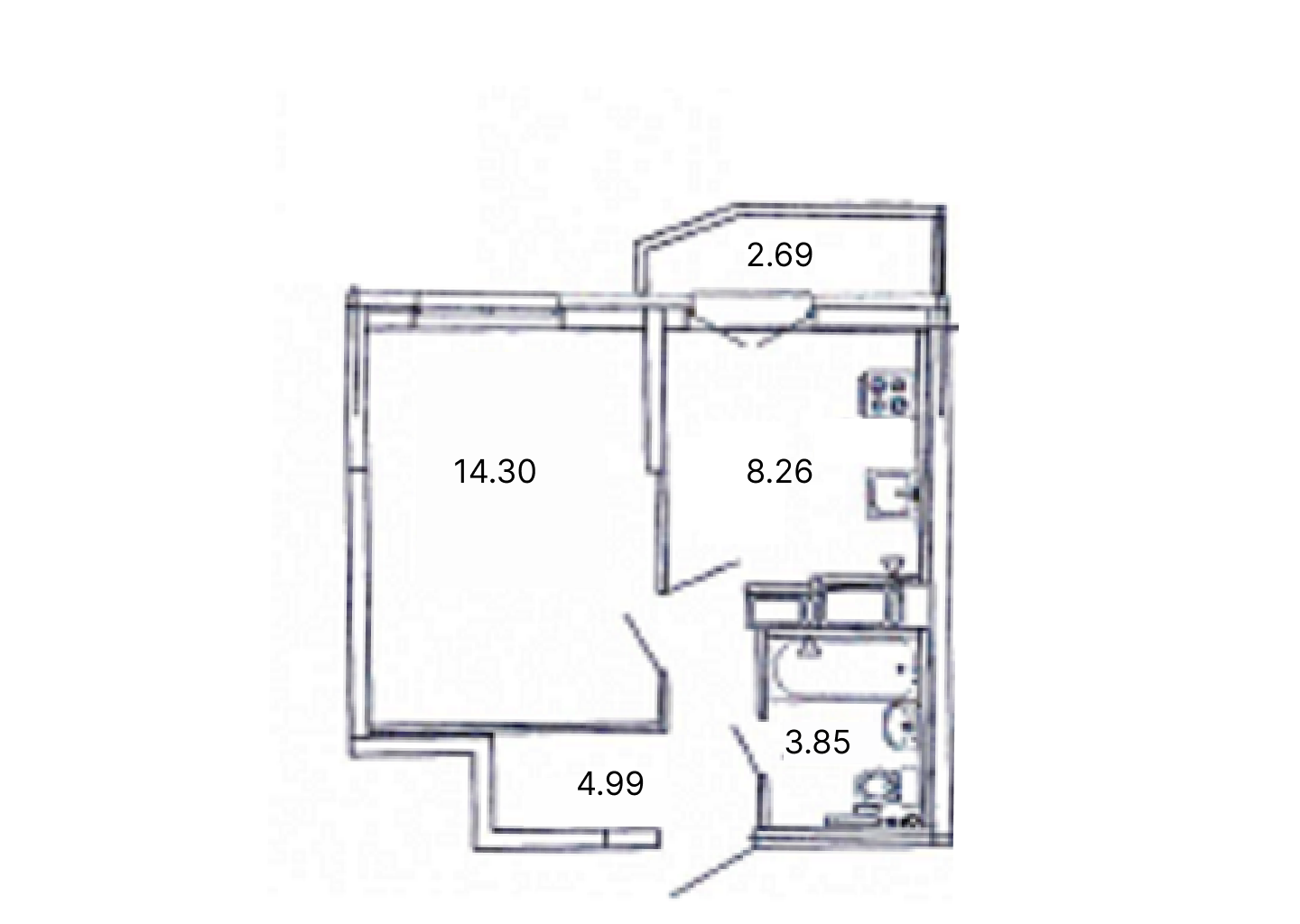 Кухня-столовая 8.3 кв.м. дополнена балконом 2.7 кв.м. с остеклением в пол, который может служить дополнительным пространством для хранения вещей или отдыха. Балкон оснащён двустворчатыми дверьми, что делает это место доступнее для прохода. В спальной комнате 14.3 кв.м. можно выделить зону для работы или учебы. Прихожая 5 кв.м. с местом под шкаф. Санузел совмещенный.