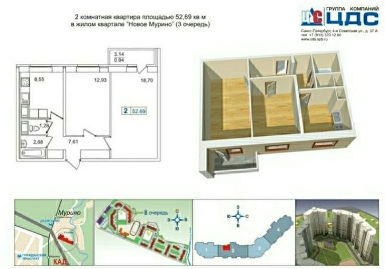 Кухня 9 м2 и две спальни 13 м2 и 19 м2. Такая планировка удобна для комфортного размещения семье с детьми. Балкон застеклен. Окна выходят во двор, в квартире всегда много света. Вид на спортивную площадку, школу, детский сад и в благоустроенный двор. Входная группа оборудована системой безопасности, включая видеонаблюдение в общественных зонах. В данном районе прекрасная инфраструктура, несколько сетевых магазинов, аптеки, пекарни, детские сады и школы. До ЖД станции Девяткино и метро 15 минут прогулочным шагом. Удобный выезд на КАД.