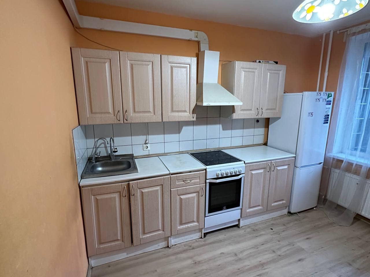 В квартире есть кухонный гарнитур, холодильник, стиральная машинка, шкафы, кровати.