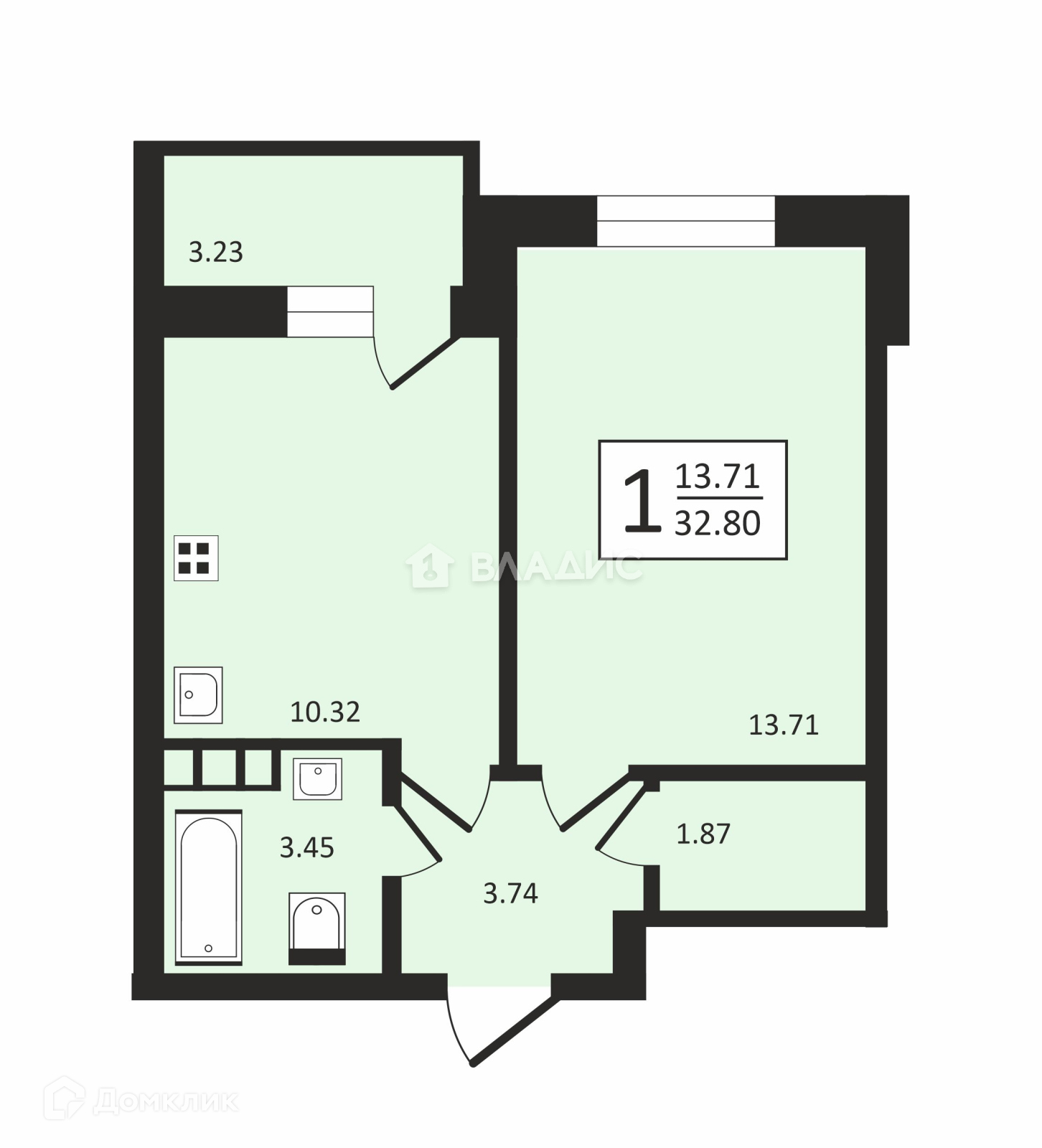 Общая площадь 32.8 м2