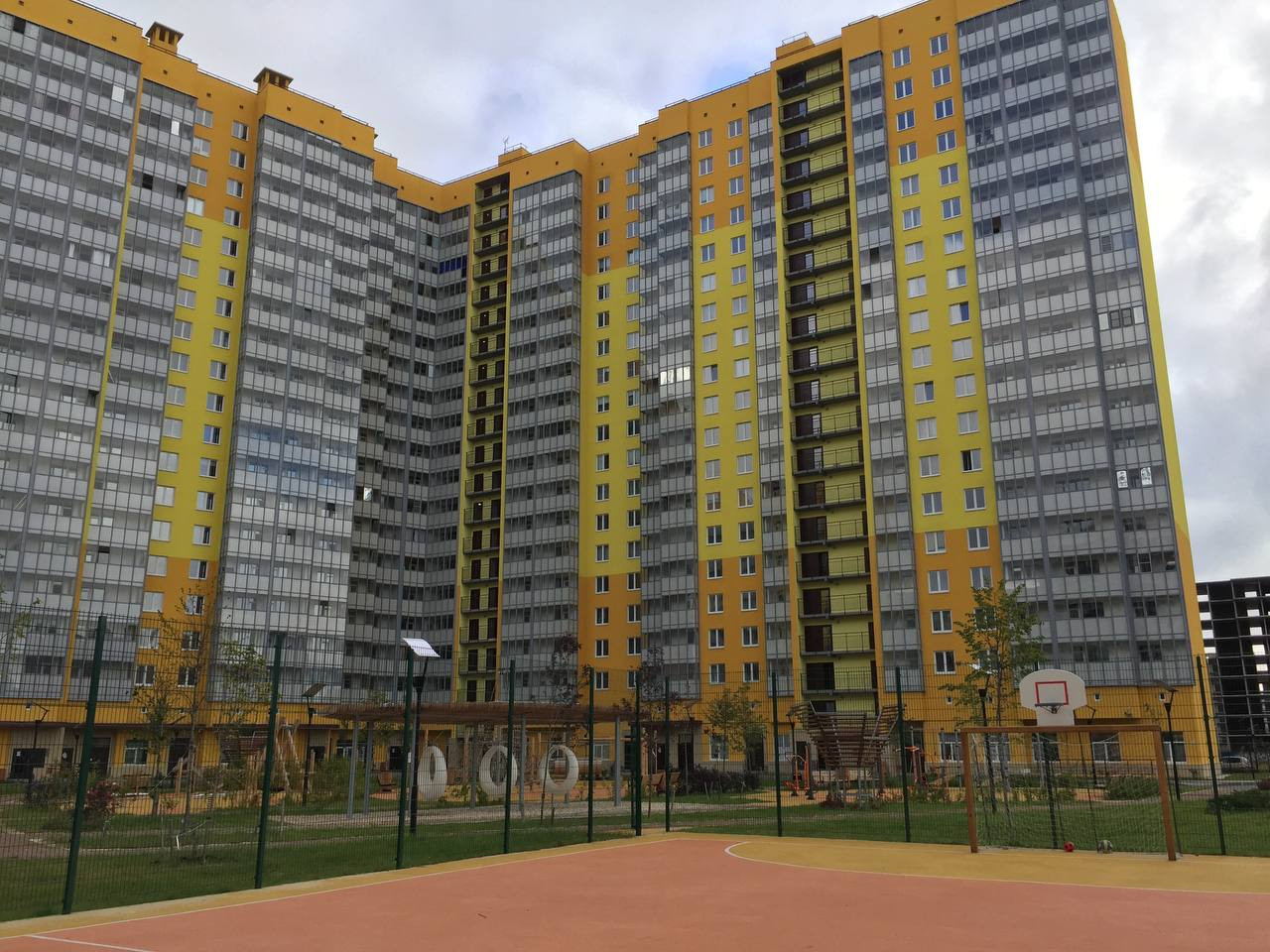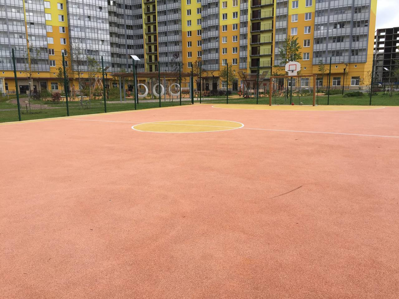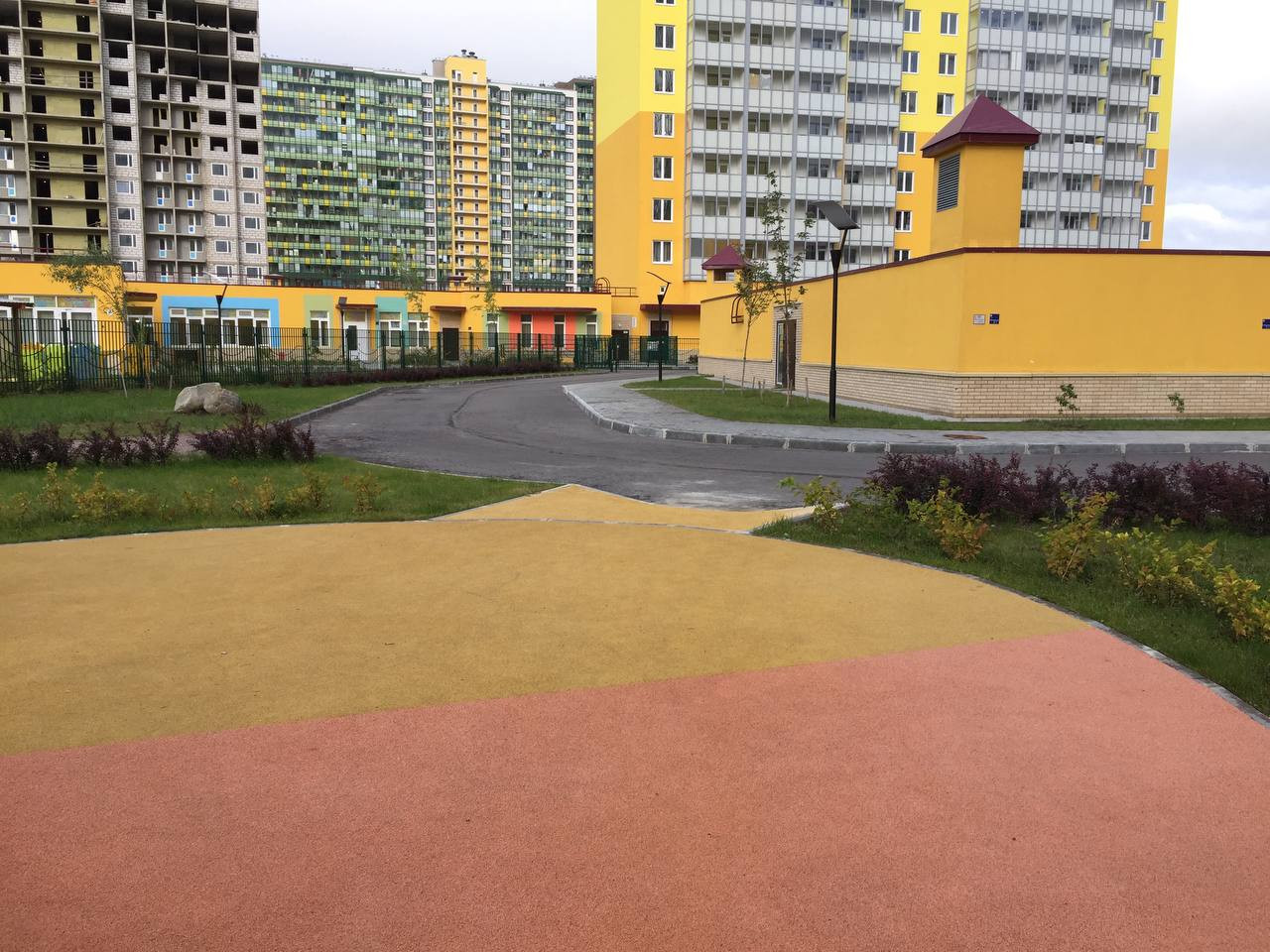 Закрытый двор с детским садом и спортивной площадкой.