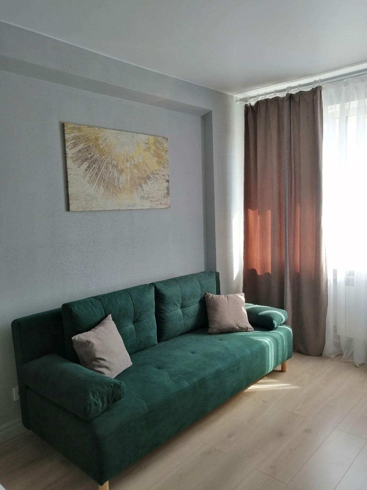 На стенах обои под покрас, на полу ламинат .