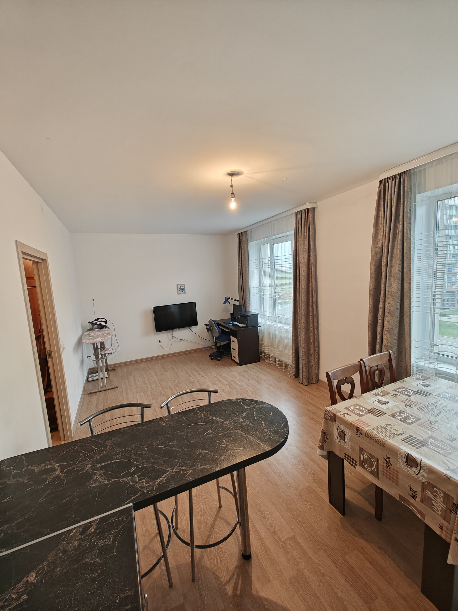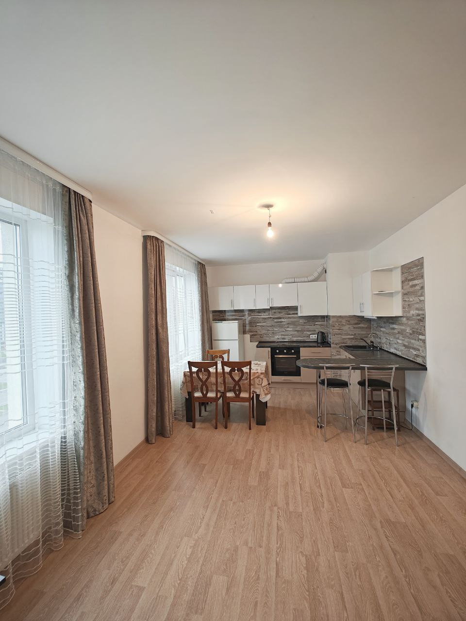 Большая кухня гостиная с двумя окнами