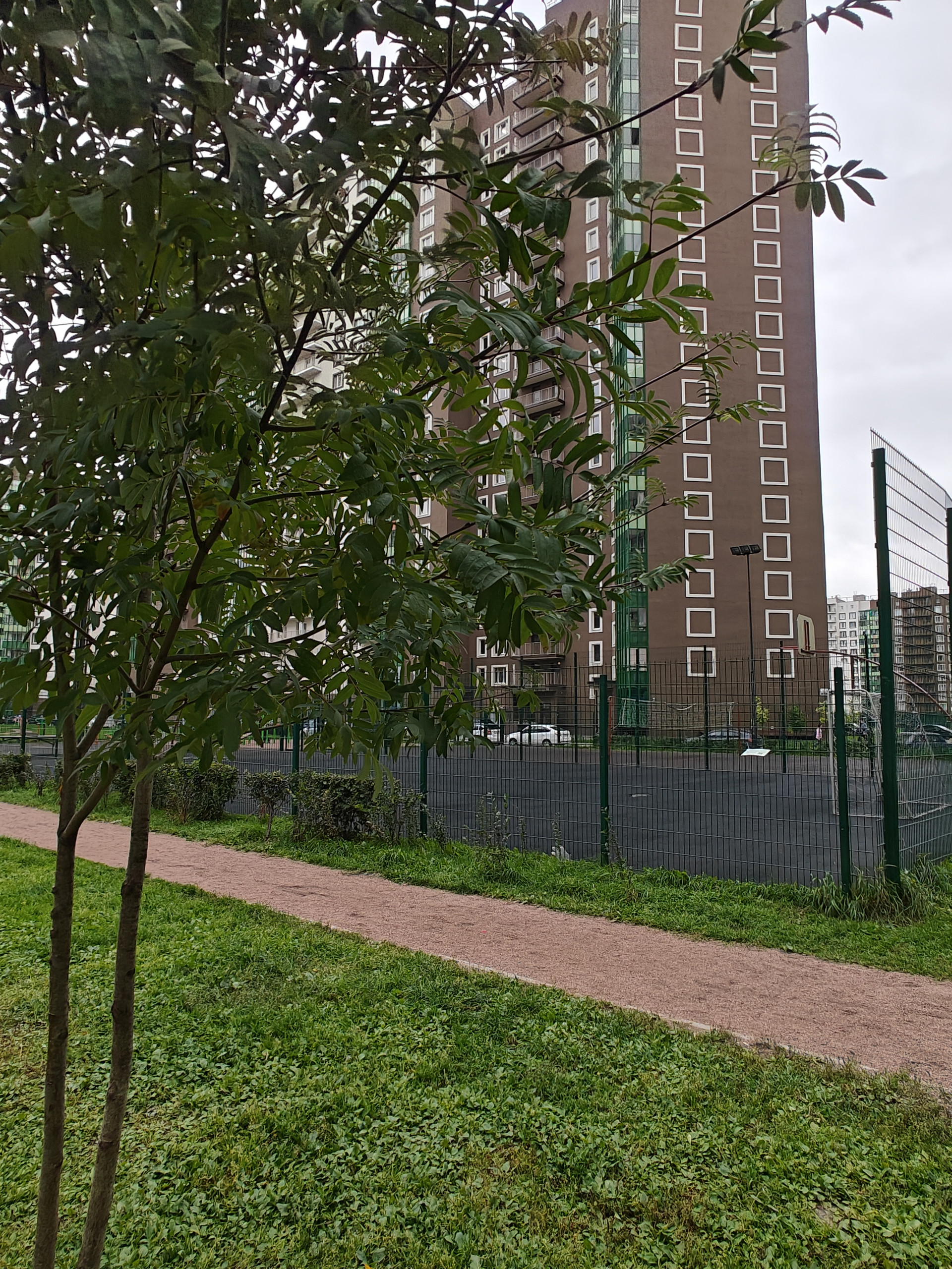 Большой просторный двор с детской площадкой и полем для игры в футбол/баскетбол