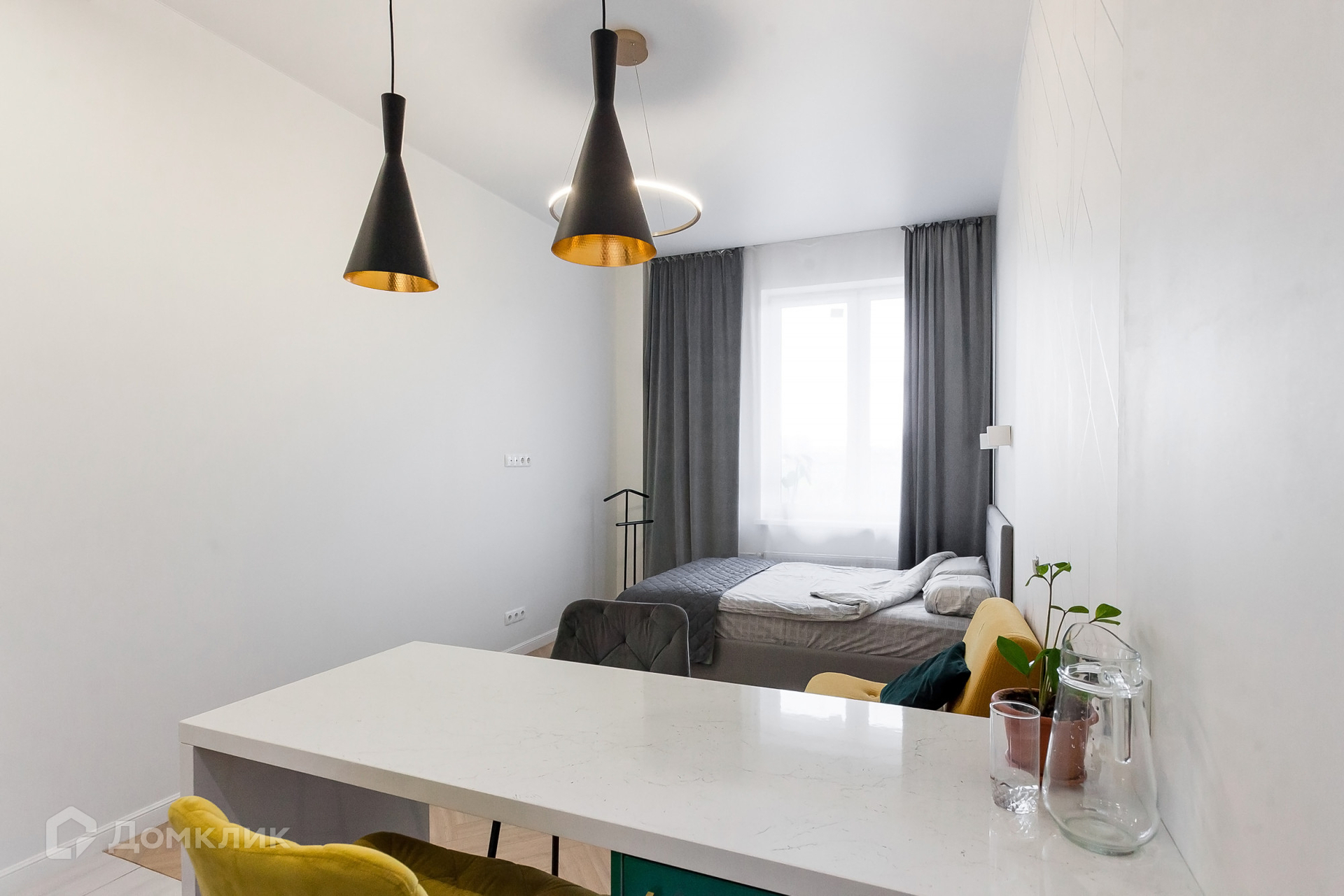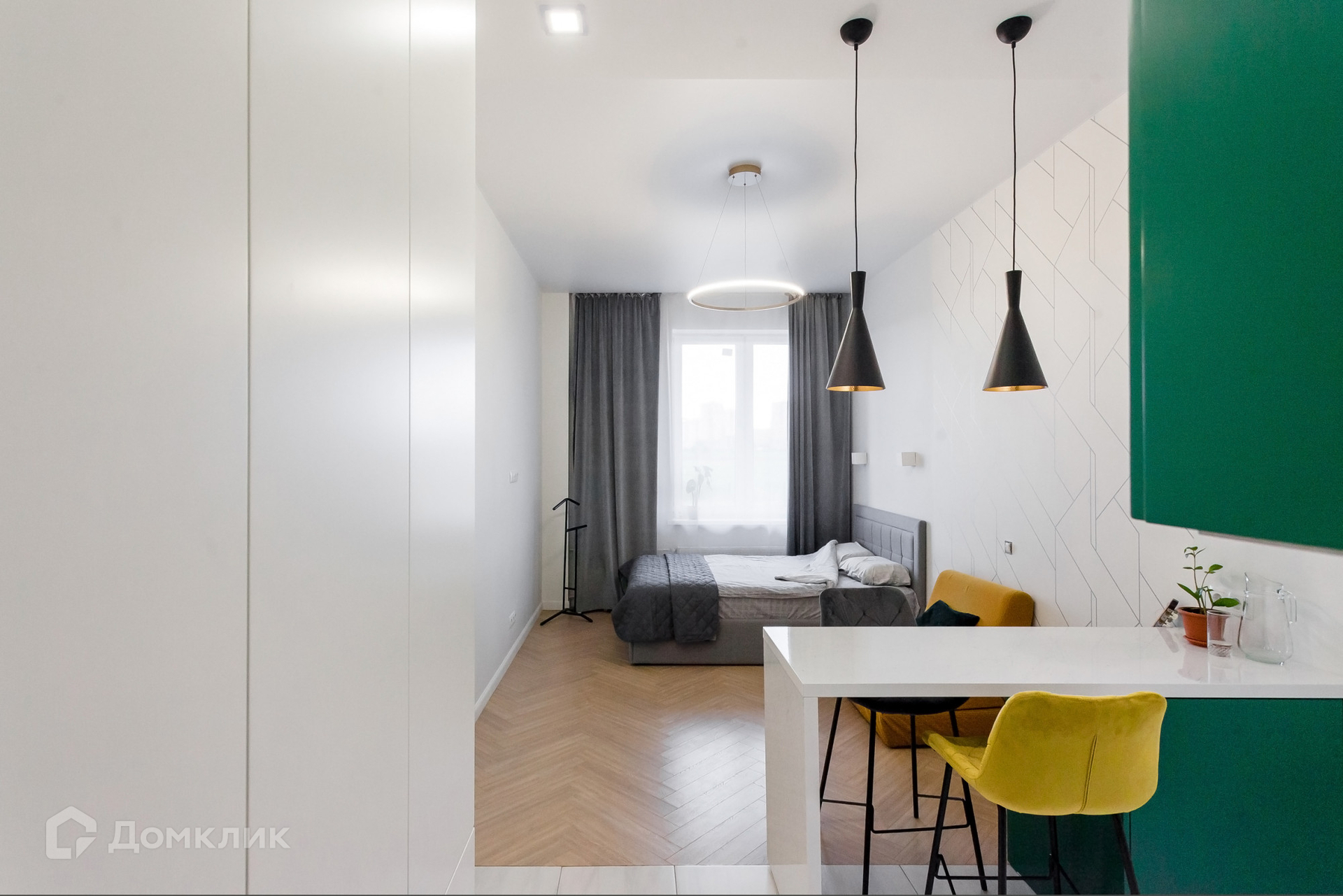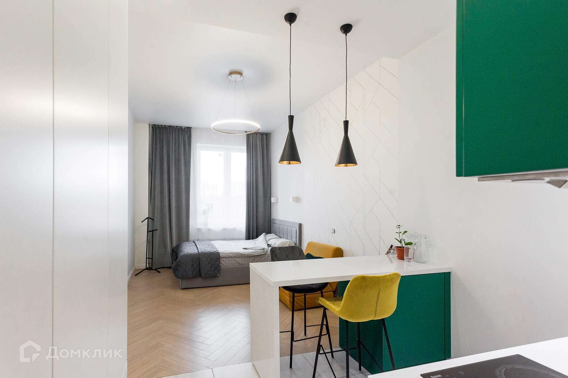 Выполнен качественный ремонт, есть все необходимое для проживания (кровать, кухонный гарнитур с барной стойкой, холодильник, варочная панель, духовой шкаф, микроволновая печь, стиральная машина, большой шкаф);