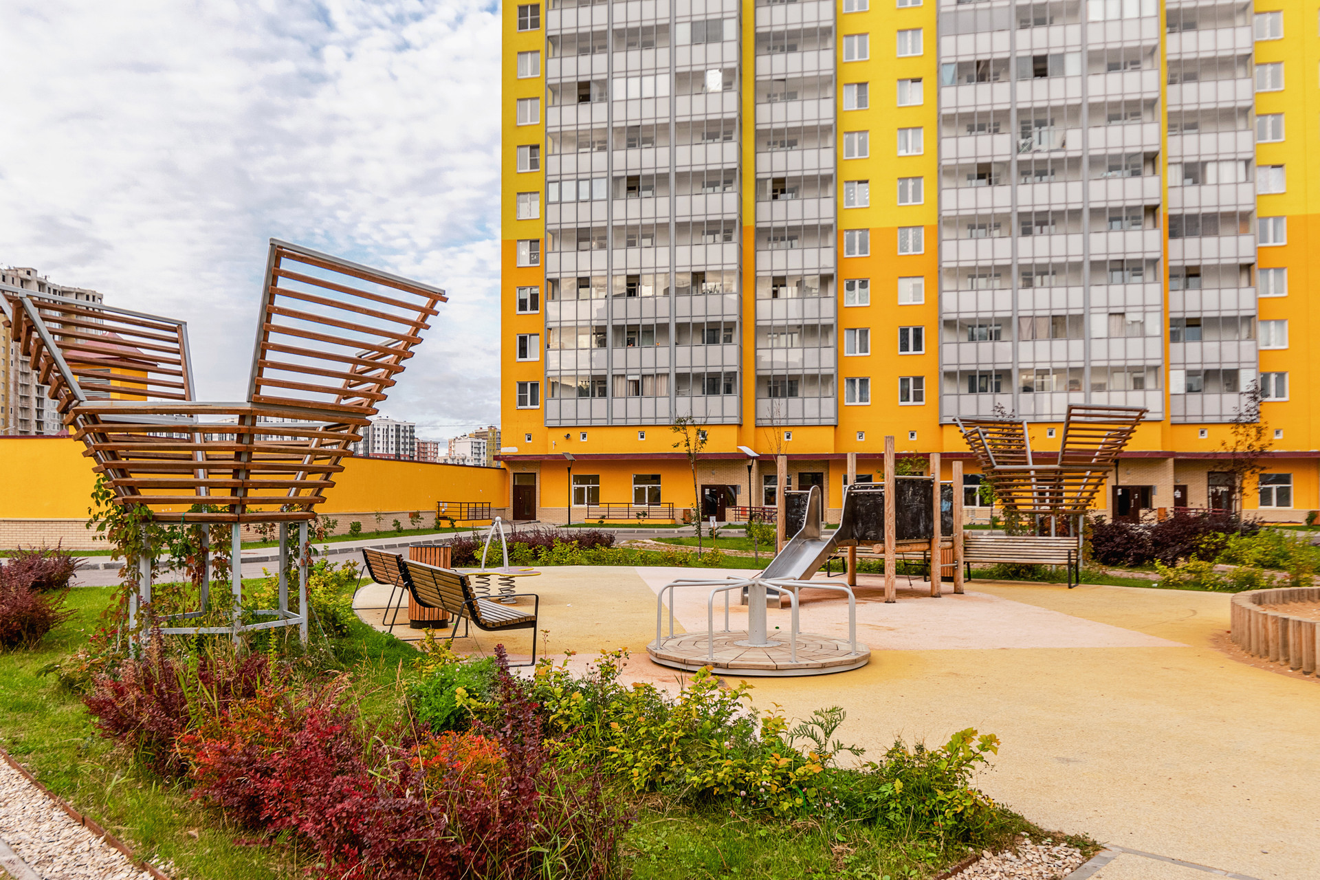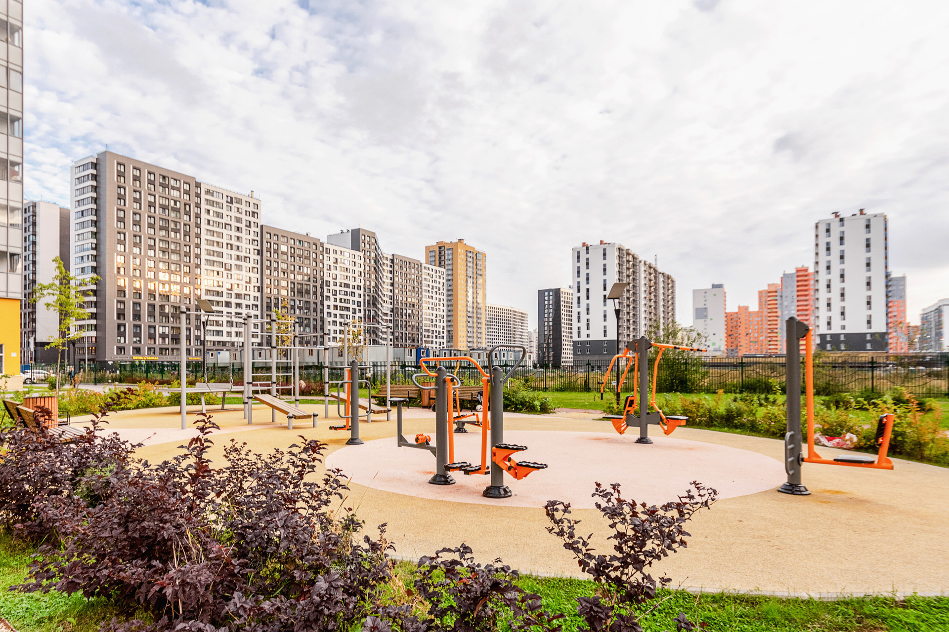 Закрытый двор с детскими площадками, тренажерами,