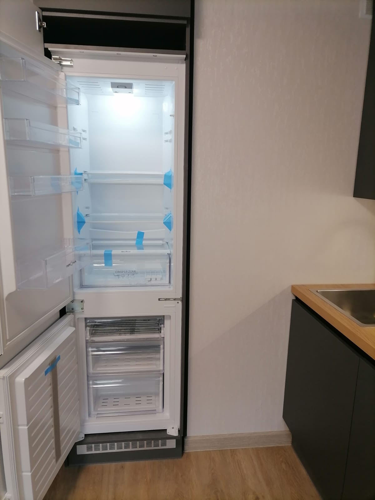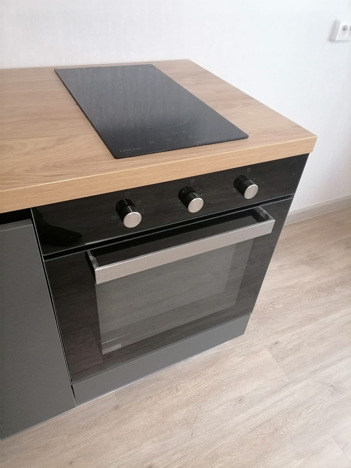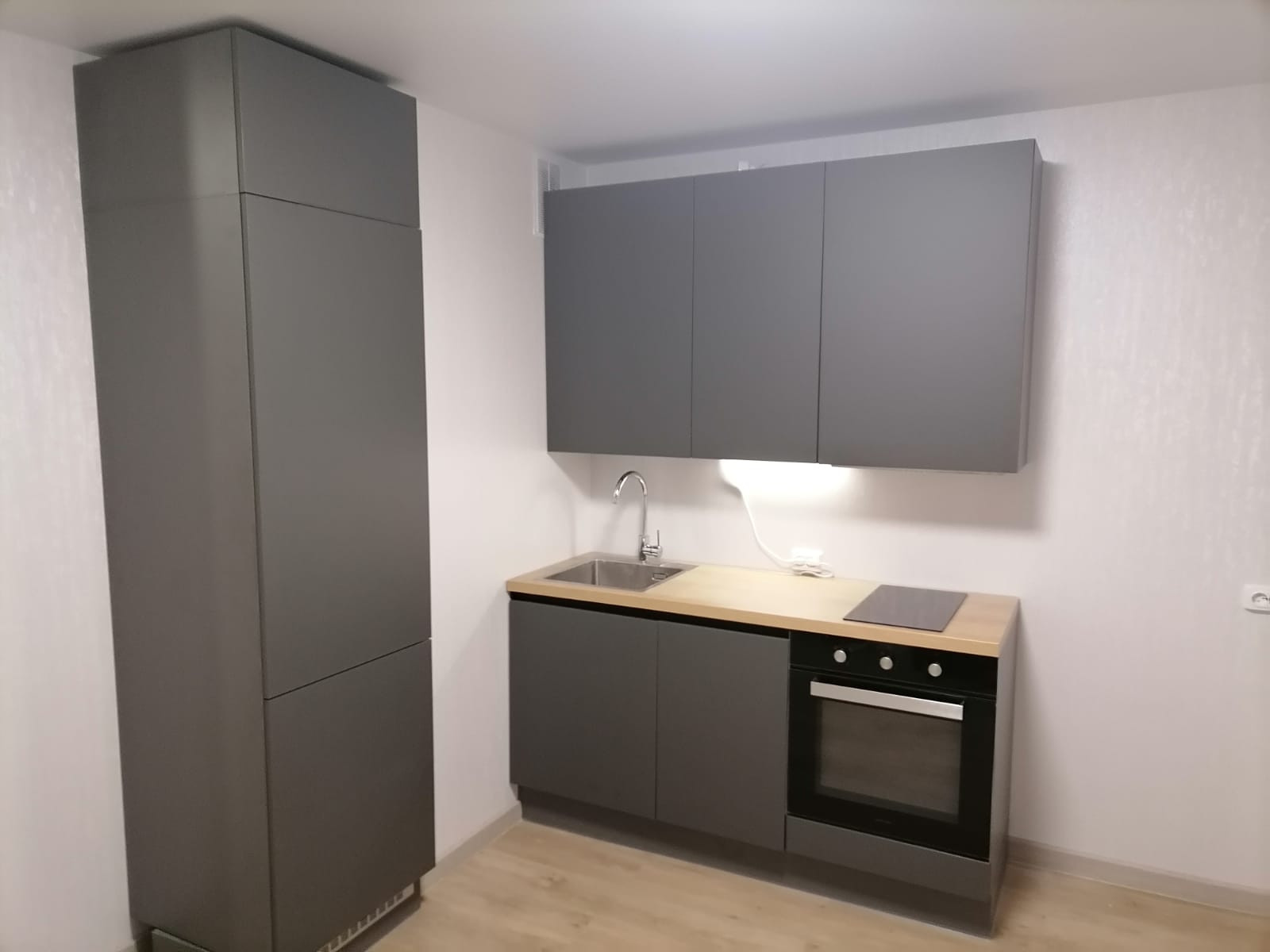 В квартире установлена новая кухня с новой встроенной бытовой техникой - холодильником, индукционной плитой, вытяжкой, духовкой и посудомоечной машиной шириной 45 см.