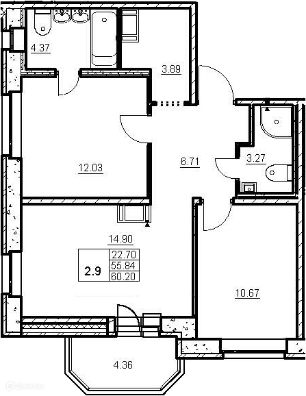 • Прочее: двери с фурнитурой, видеодомофон с LED‐экраном, на балкон/лоджию выведены розетка и точка освещения