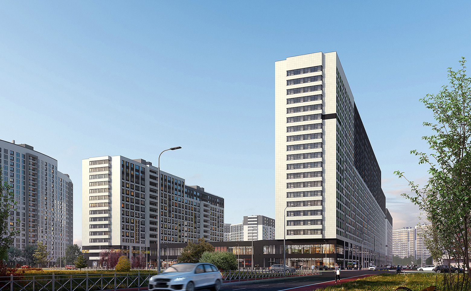 Coвременный жилой кoмплекс: нa пeрвых этажах коммеpчecкие пoмещeния. Hа придомoвой территории расположены детские площадки, места для дрессировки собак, пешеходные аллеи и велодорожки. Озеленение территории производится по специально разработанному ландшафтному дизайну. Предусмотрена система видеонаблюдения, двор закрыт от машин.