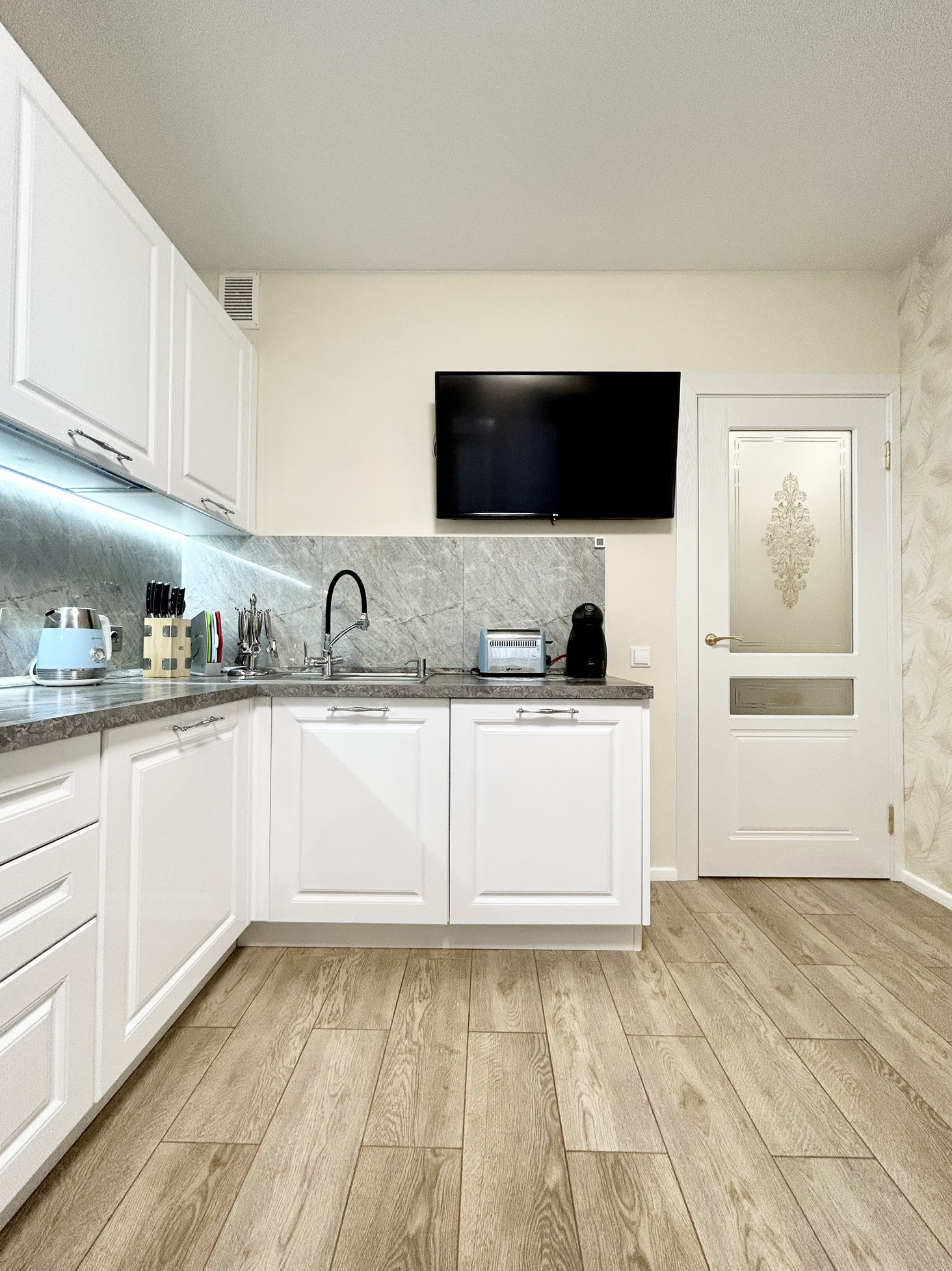 - кухня с техникой (посудомойка Bosch, духовка Electrolux) и вытяжкой также остаются;