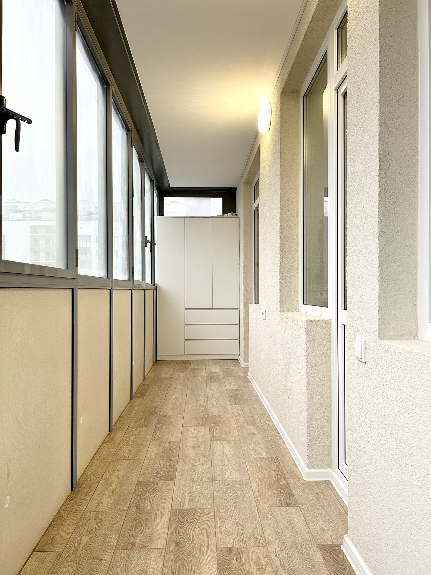 - лоджия с двумя выходами: из комнаты и кухни. Полностью отремонтирована, с освещением и розетками, шкаф в подарок;