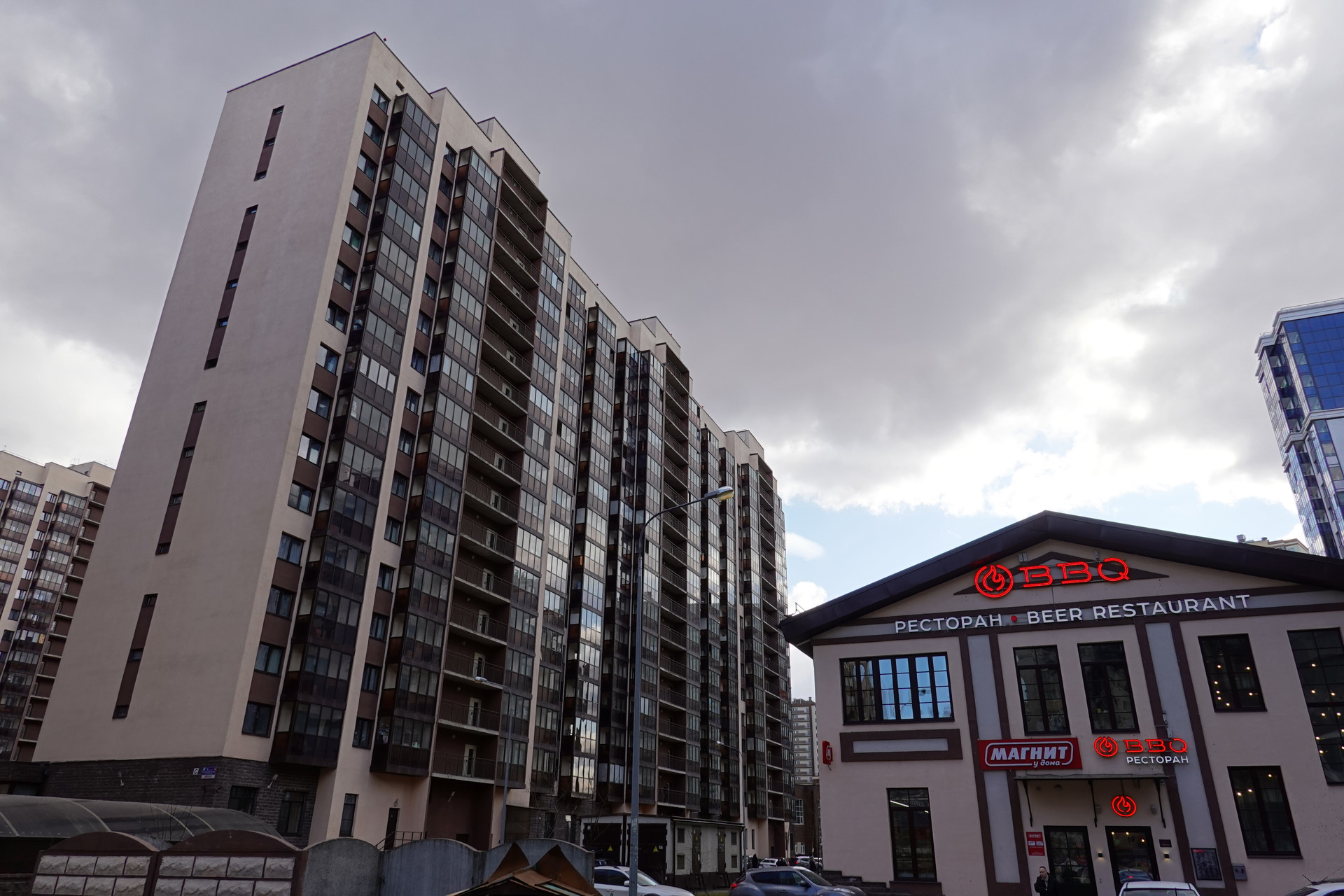 Во дворе дома находится магазин "Магнит", ресторан и открытый стадион со спортивными площадками.
