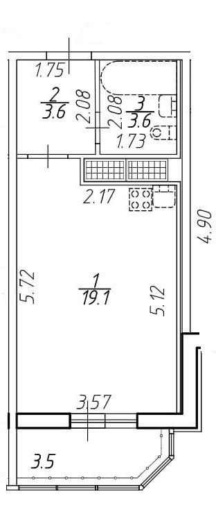 Жилая площадь 19.1 м2