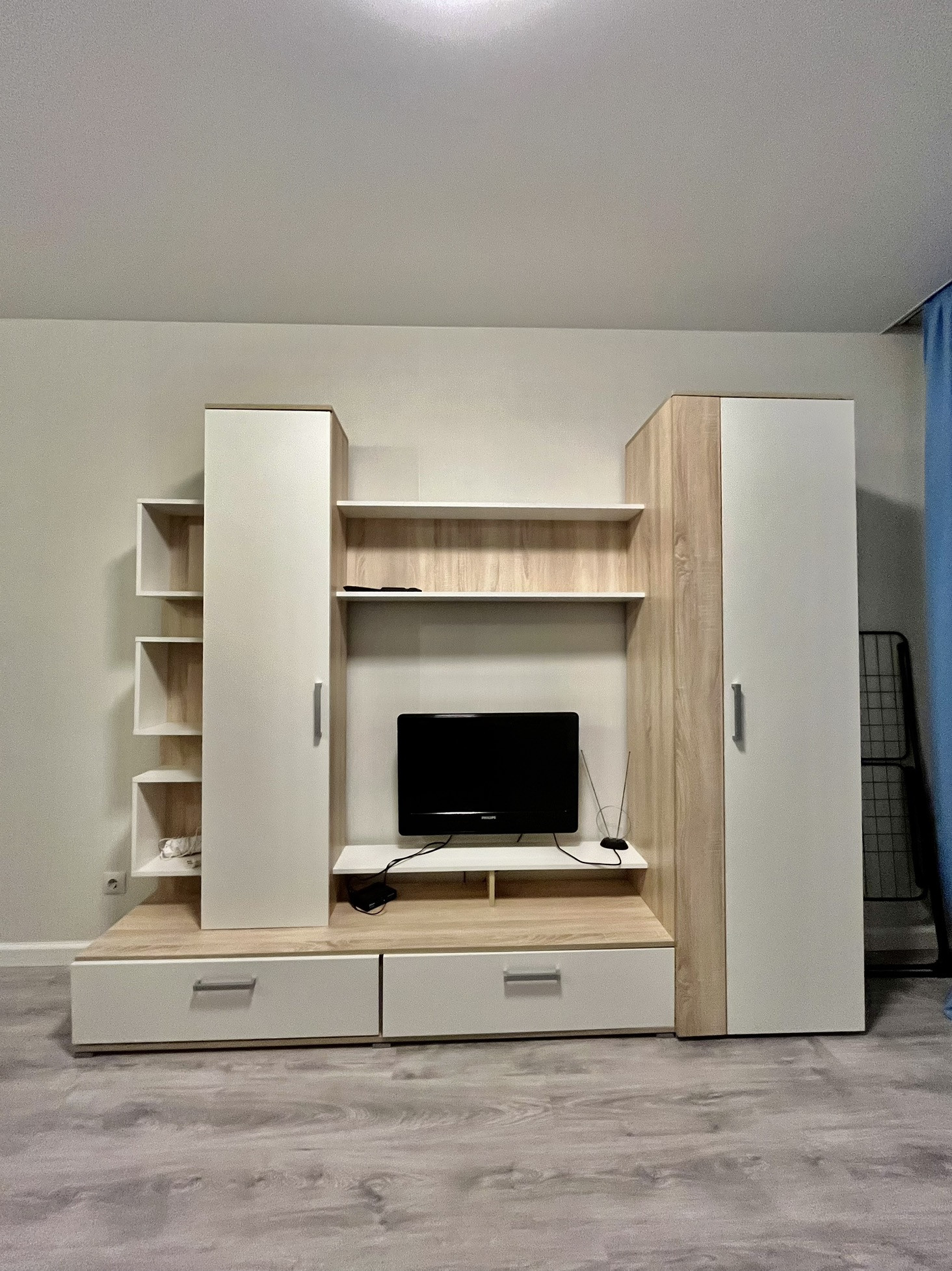 В квартире имеется кухня, встроенная варочная панель, духовой шкаф, вытяжка, холодильник, микроволновая печь, диван-кровать, стенка горка со шкафами, телевизор, стиральная машина.