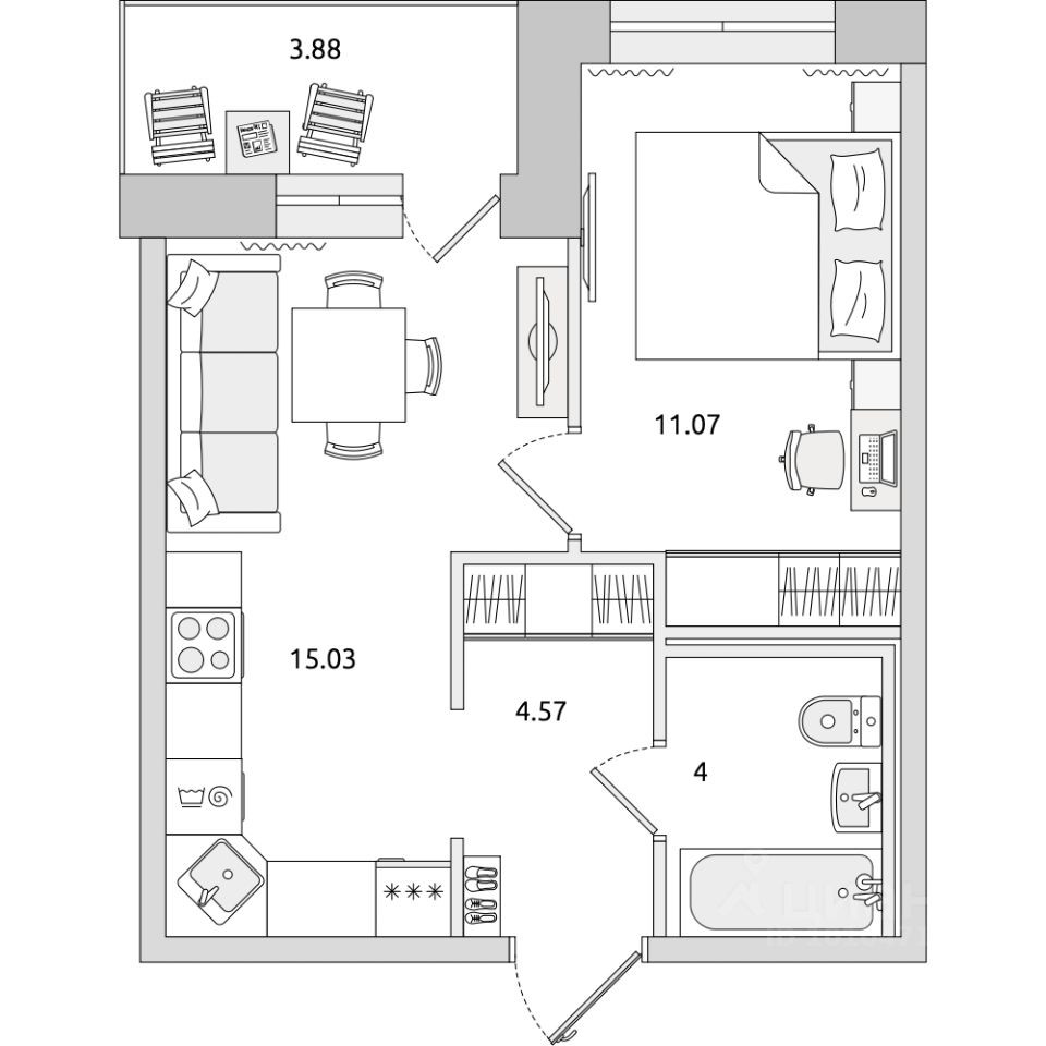 Площадь кухни 15.03 м2