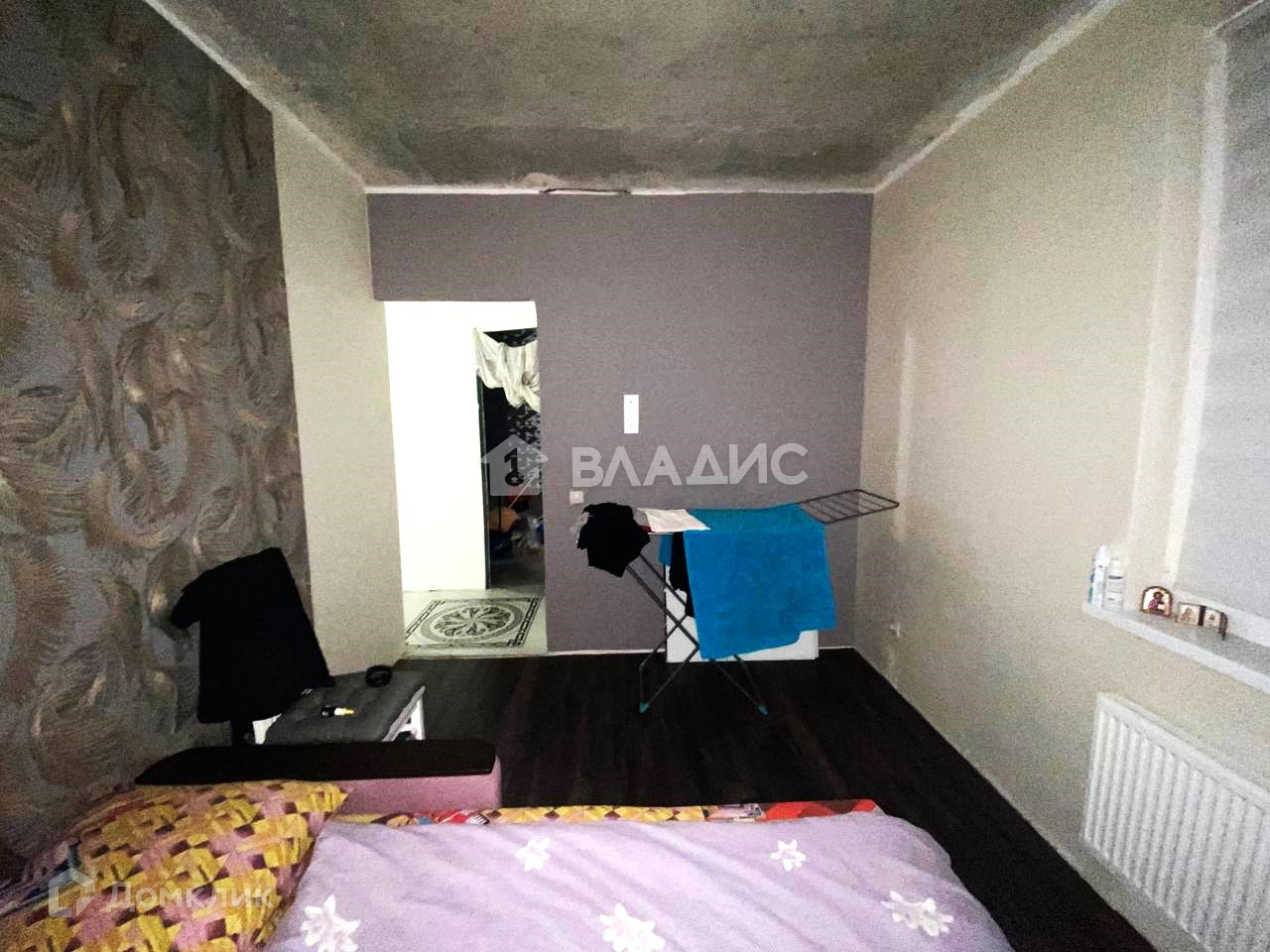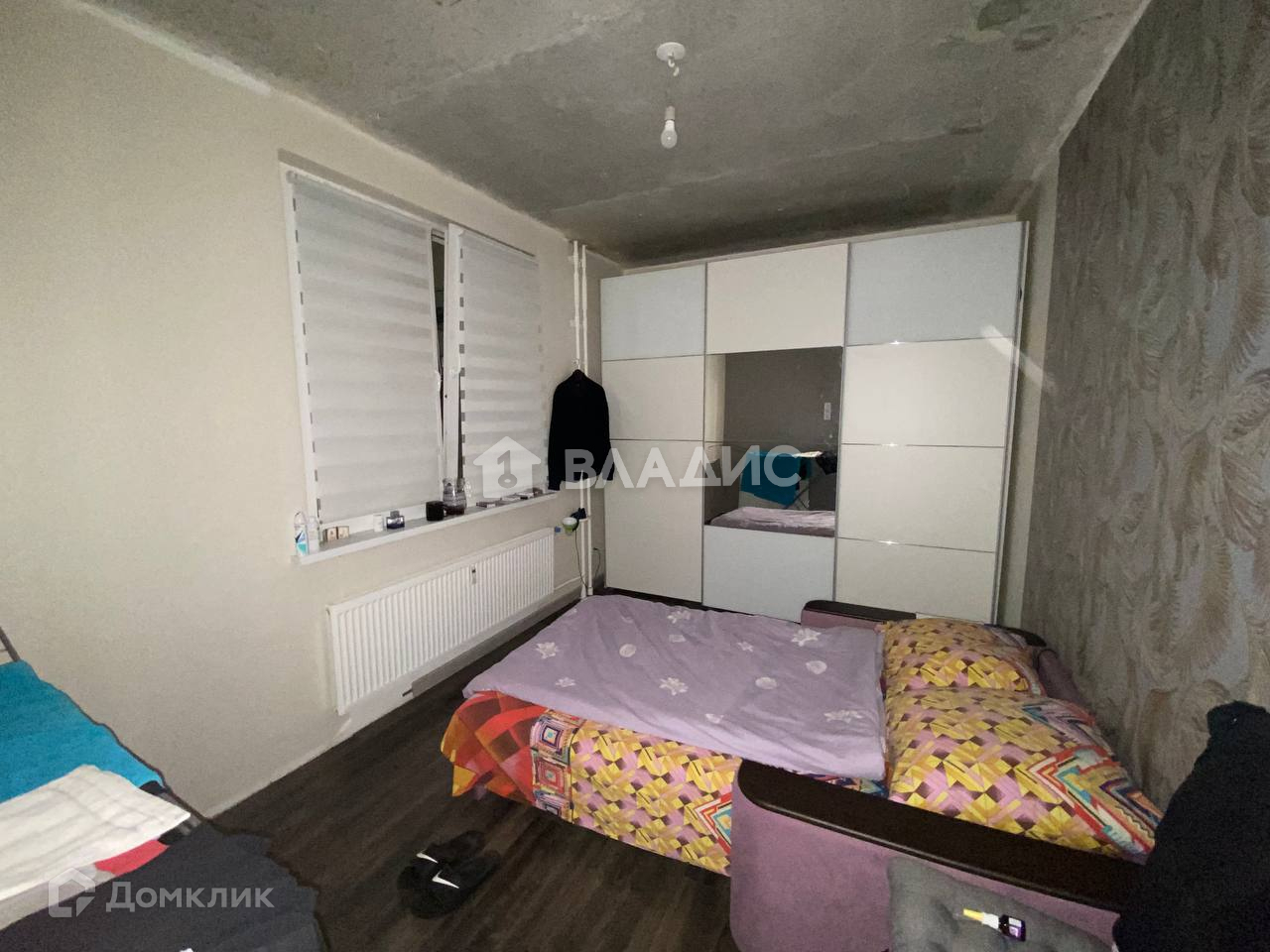 - Гостиная комната: пол: ламинат серой палитры, стены: штукатурка. Спальная комната: пол: темный ламинат, стены: частично выполнен косметический ремонт: обои серого и фиолетового цвета, присутствует штукатурка, встроен вместительный светлый шкаф.