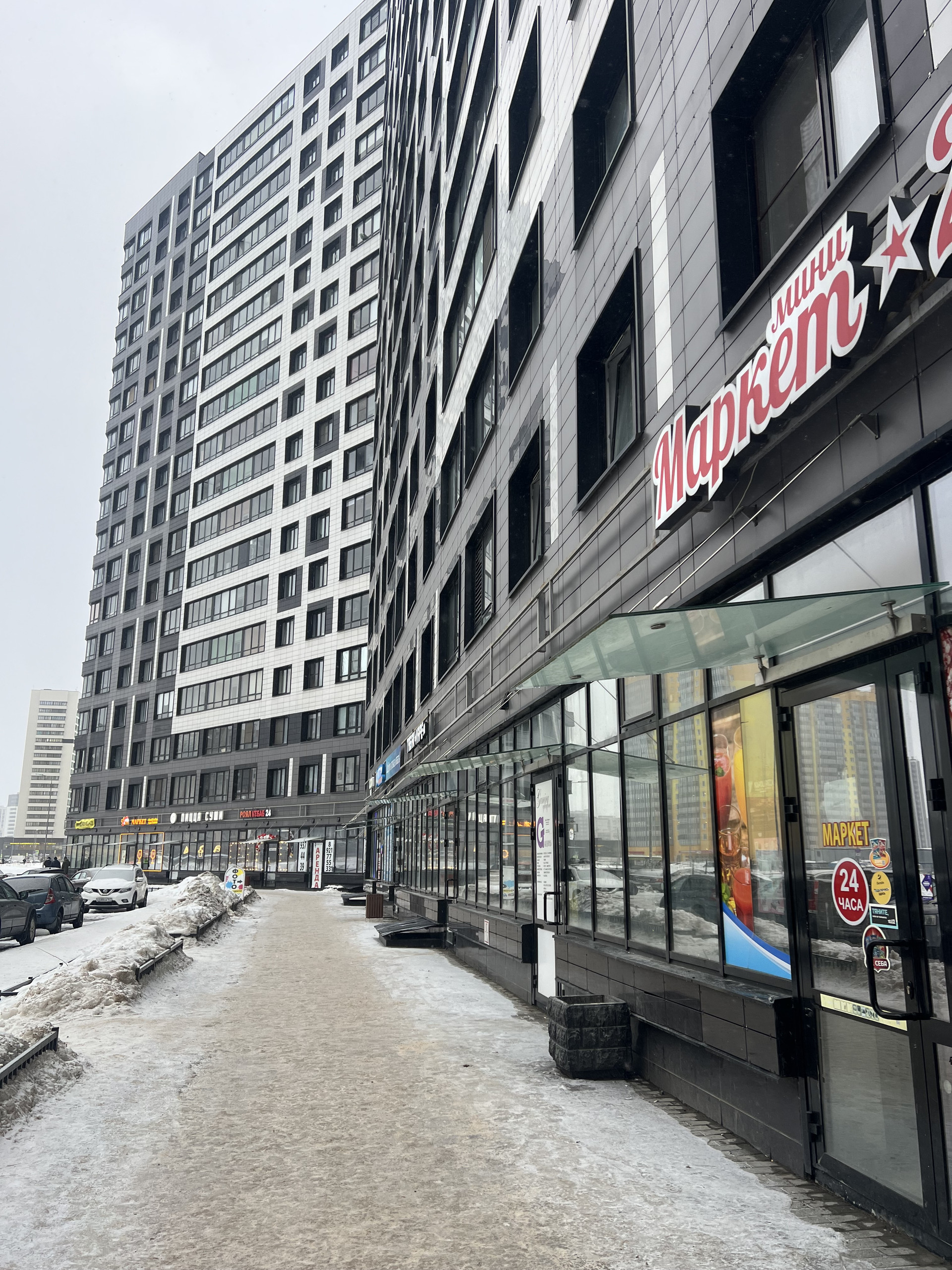 На первом этаже дома  множество коммерческих помещений: кафе, магазины.