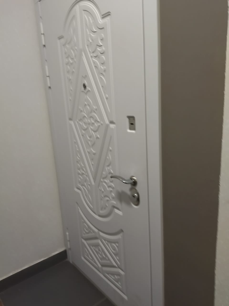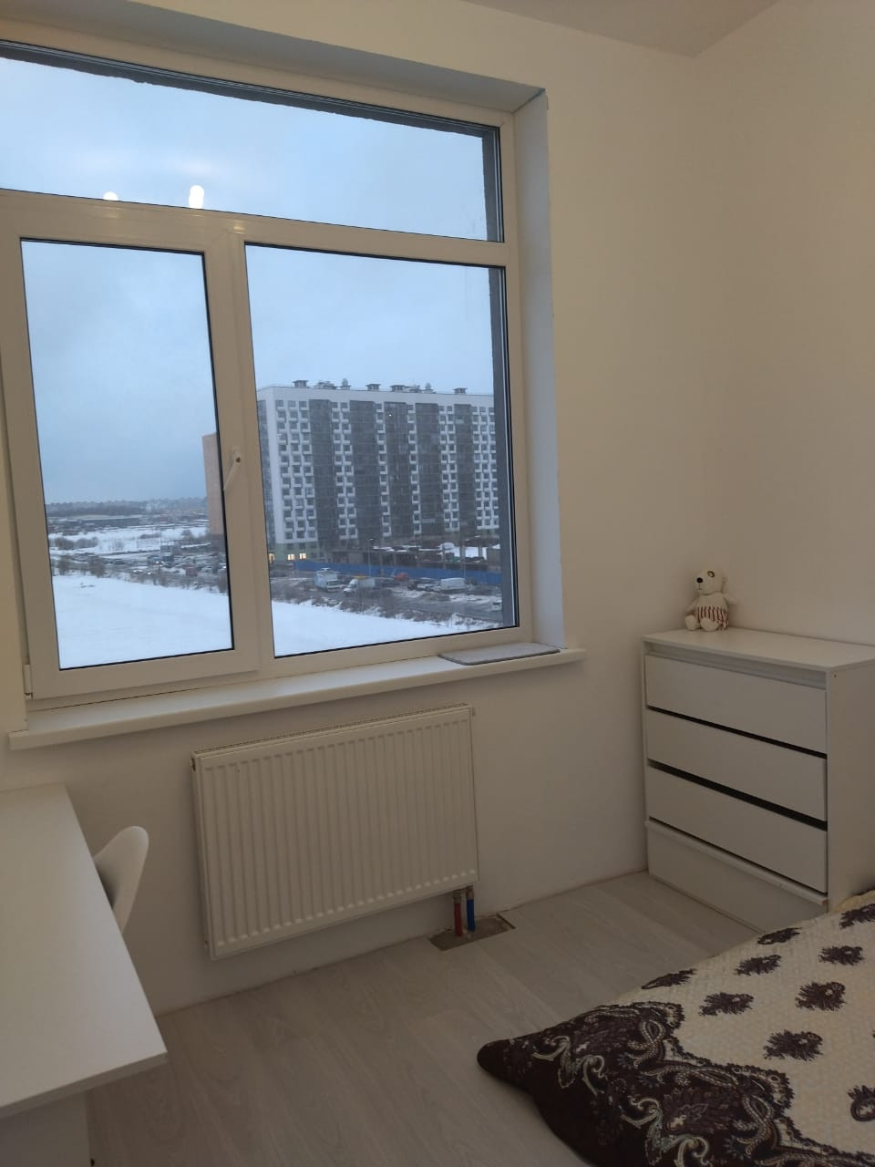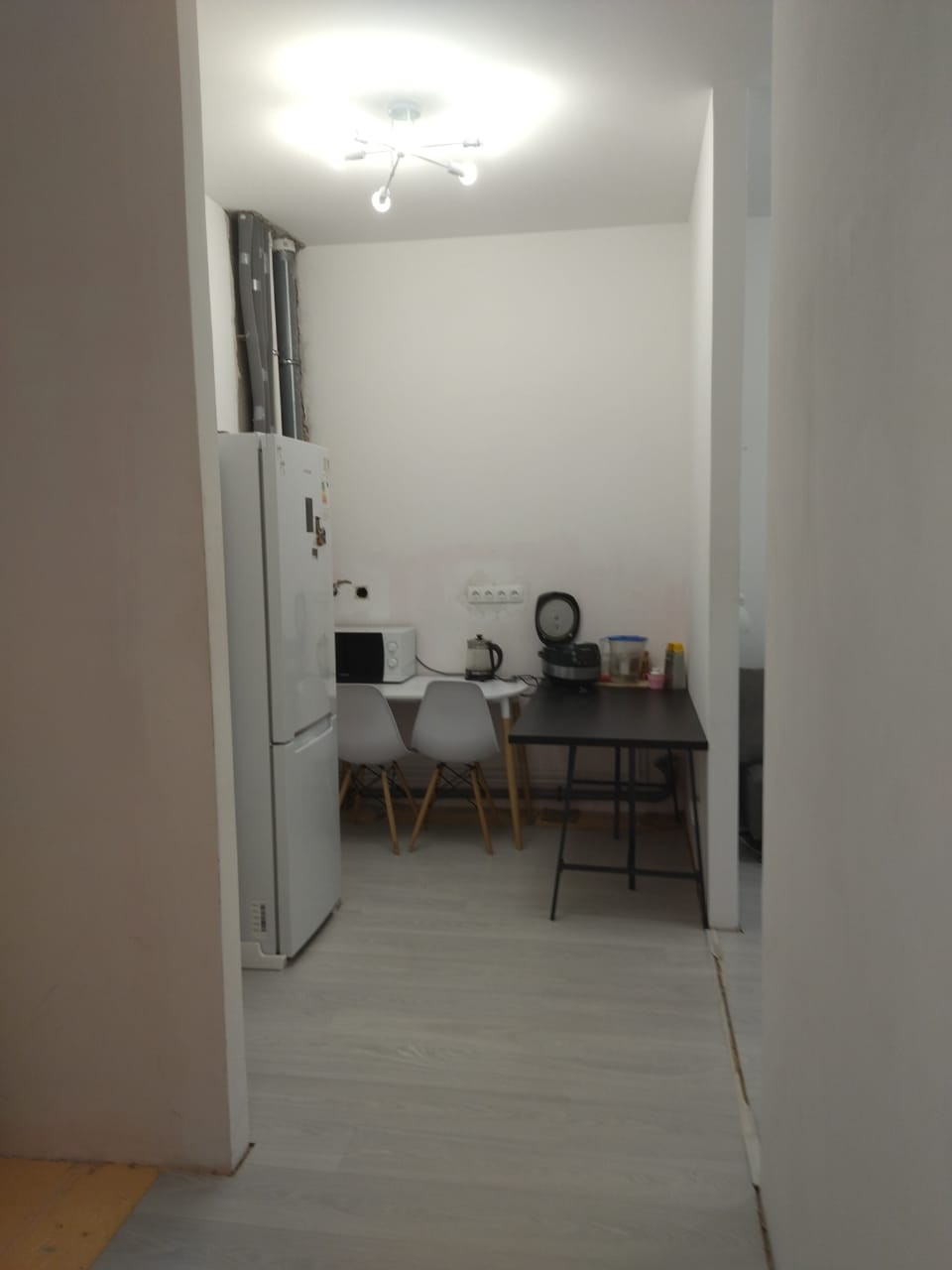 Зональное распределение выделяет спальню, гостиную и зону готовки. Есть две ниши под шкаф или гардеробную. Очень большой совмещённый санузел. На фото нет дверей, они куплены, но не поставлены.