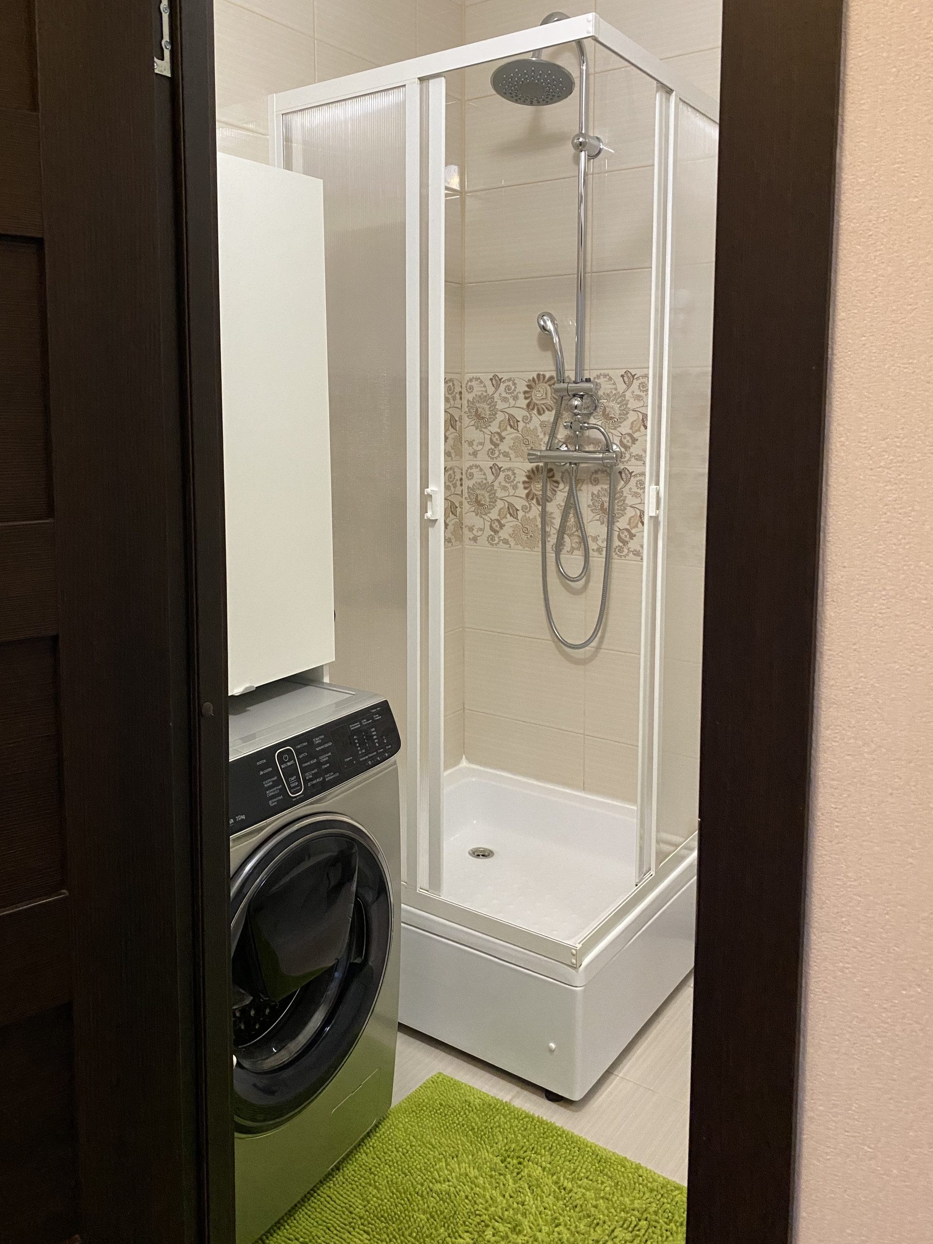 В с\у верхний “тропический” душ с термостатным смесителем, инверторная стиральная машина.