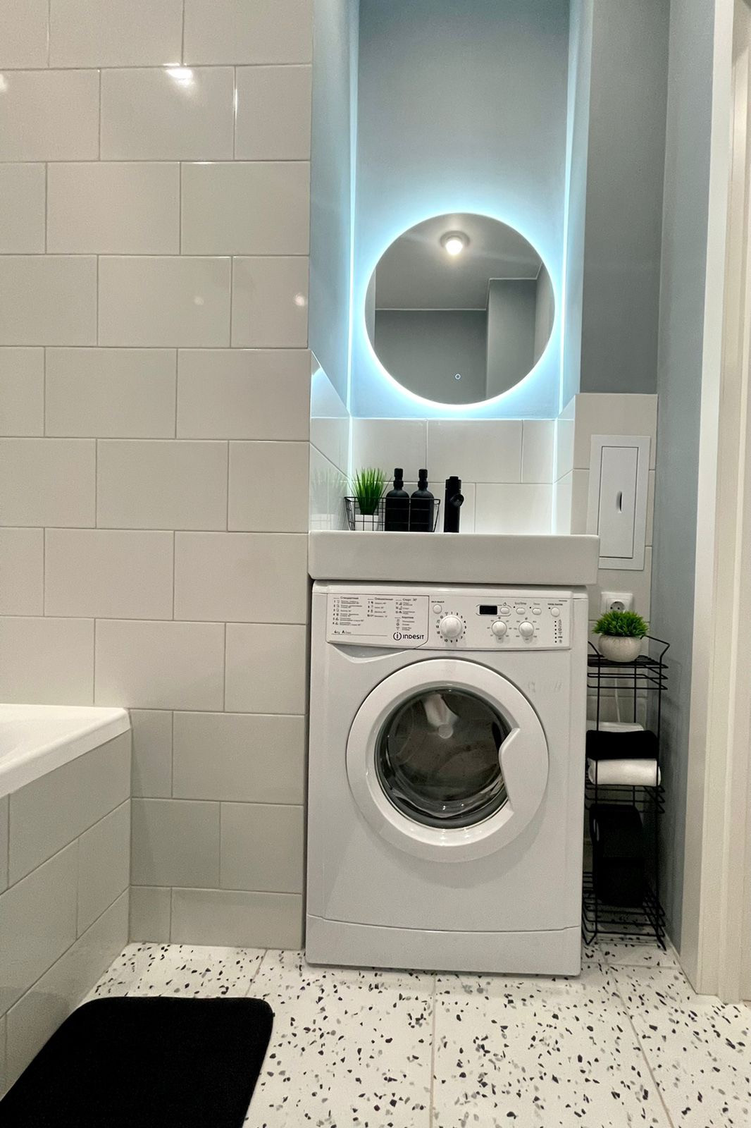 Санузел с современной сантехникой, инсталляцией и стиральной машиной.