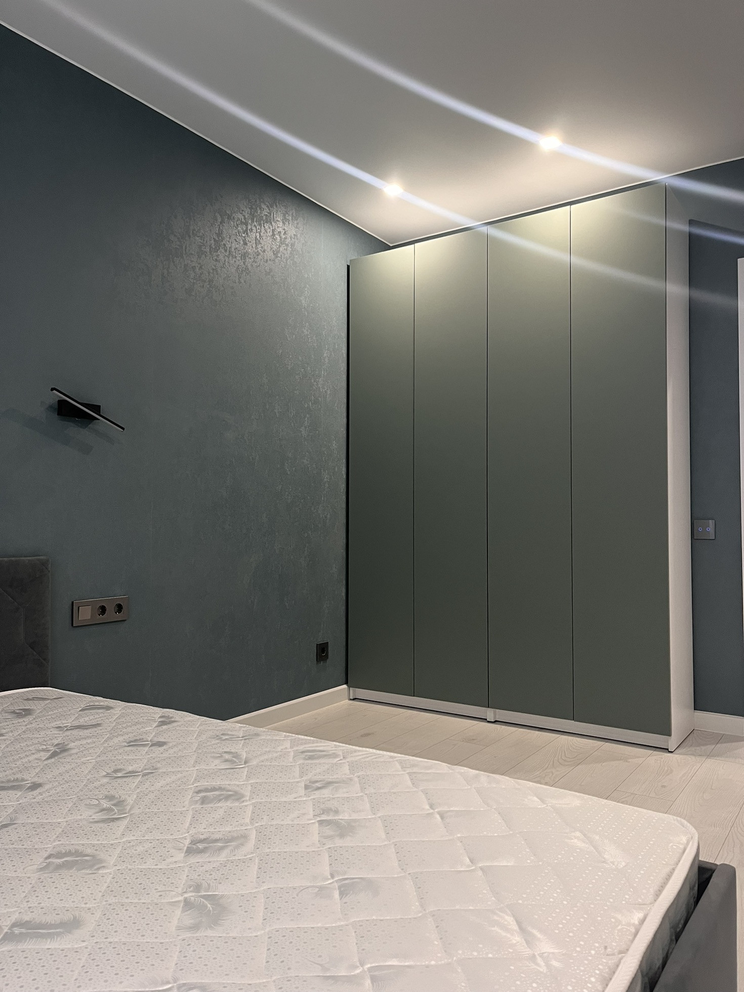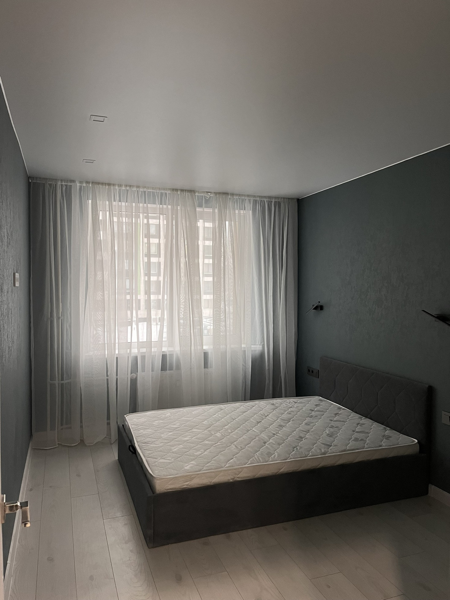 В гостиной большой телевизор 55 дюймов - LG. Система хранения в коридоре - шкаф в потолок и в комнате. Кровать с подъемным механизмом и матрасом.