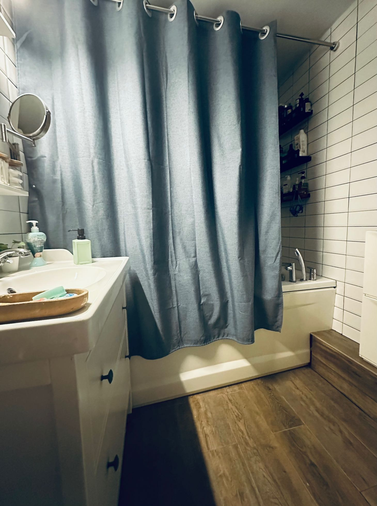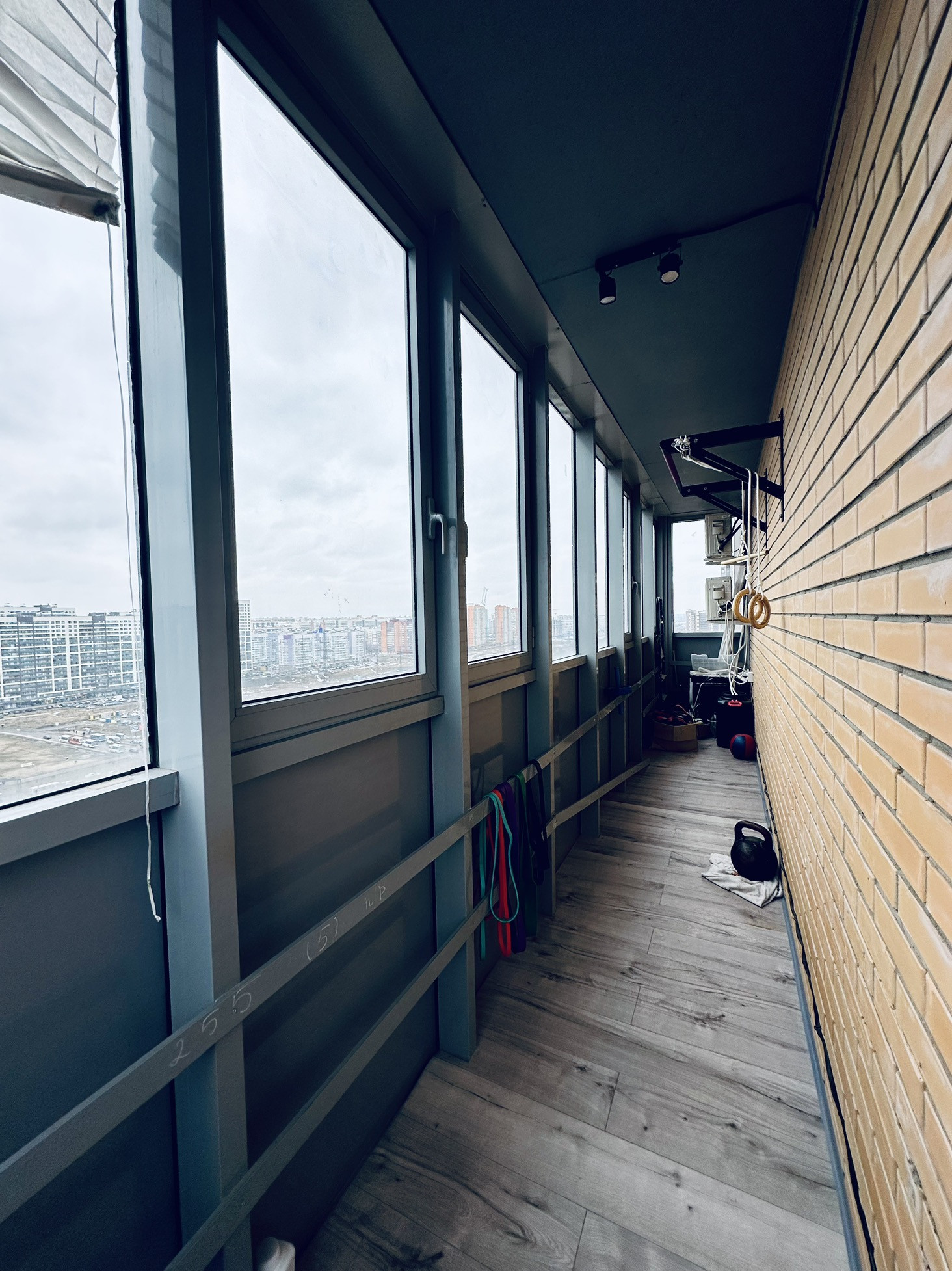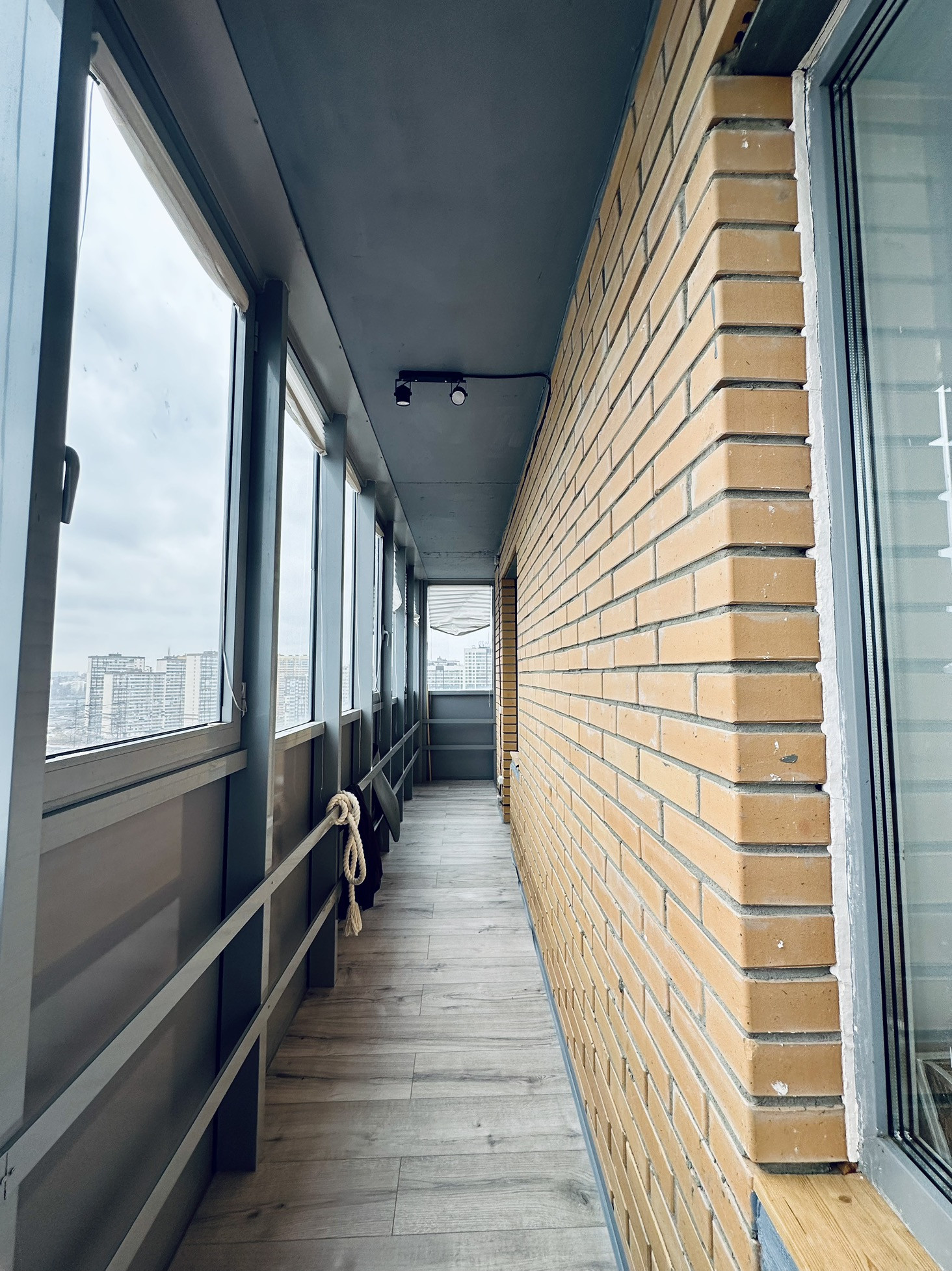 Огромный сделанный со светом и полом балкон и лоджия (14м2 и 3м2). Длинный балкон дает тот самый буфер по теплу: всю зиму спокойно отключаем батареи.