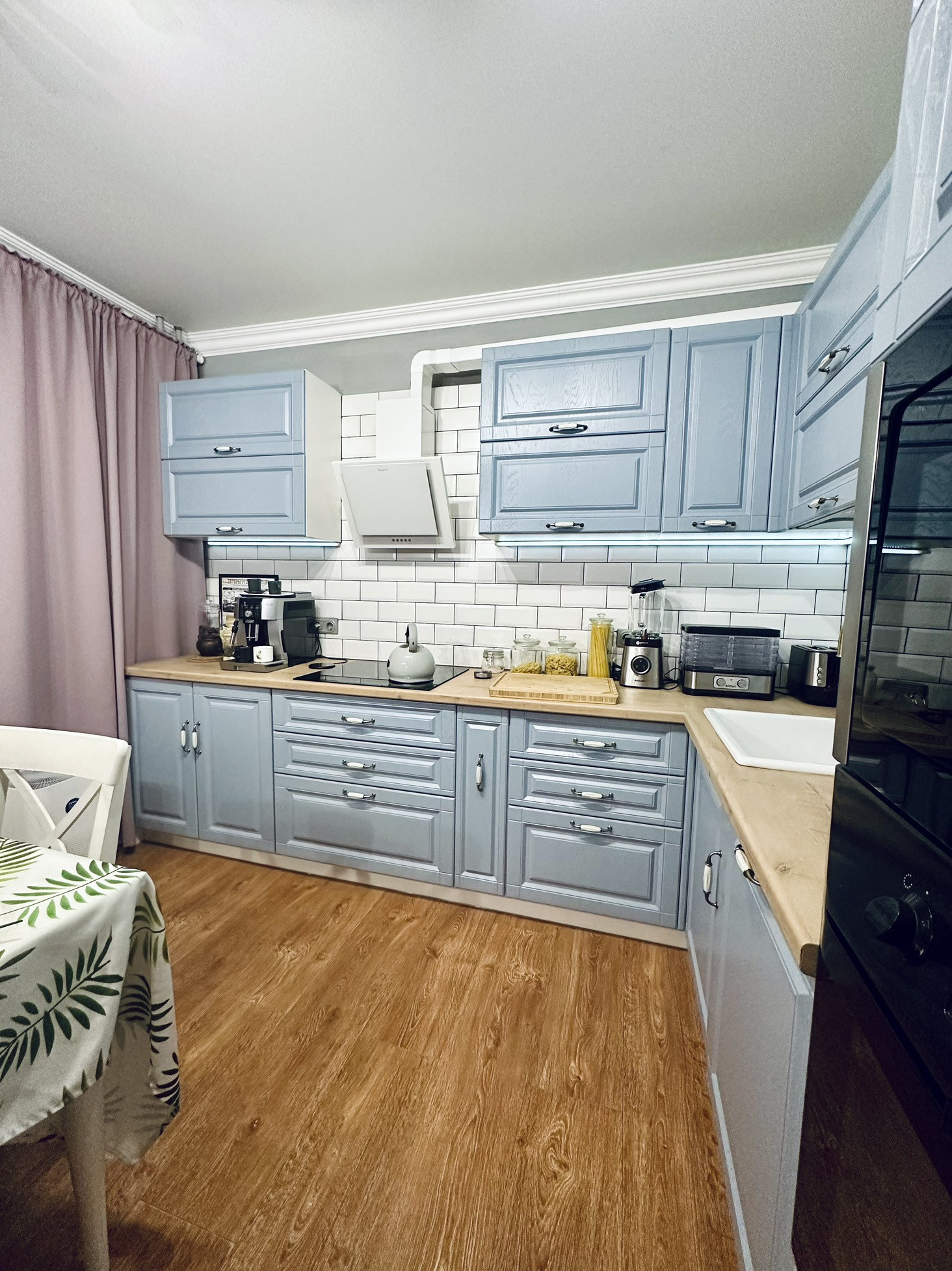 Вся кухня: варочная, духовка, микроволновка, холодильник, посудомоечная, фильтр питьевой воды, вытяжка и кофемашина delongi.