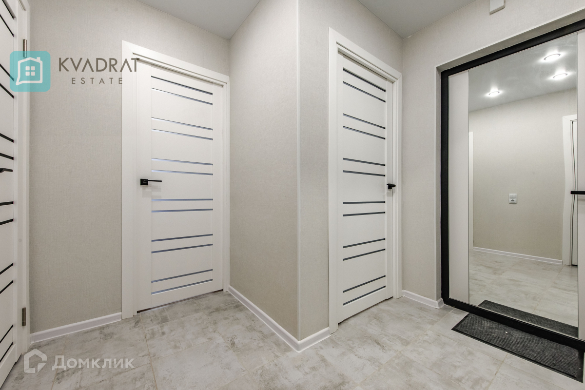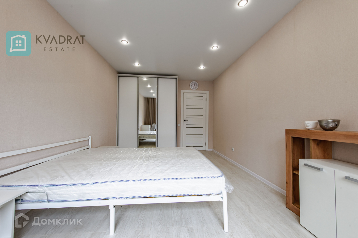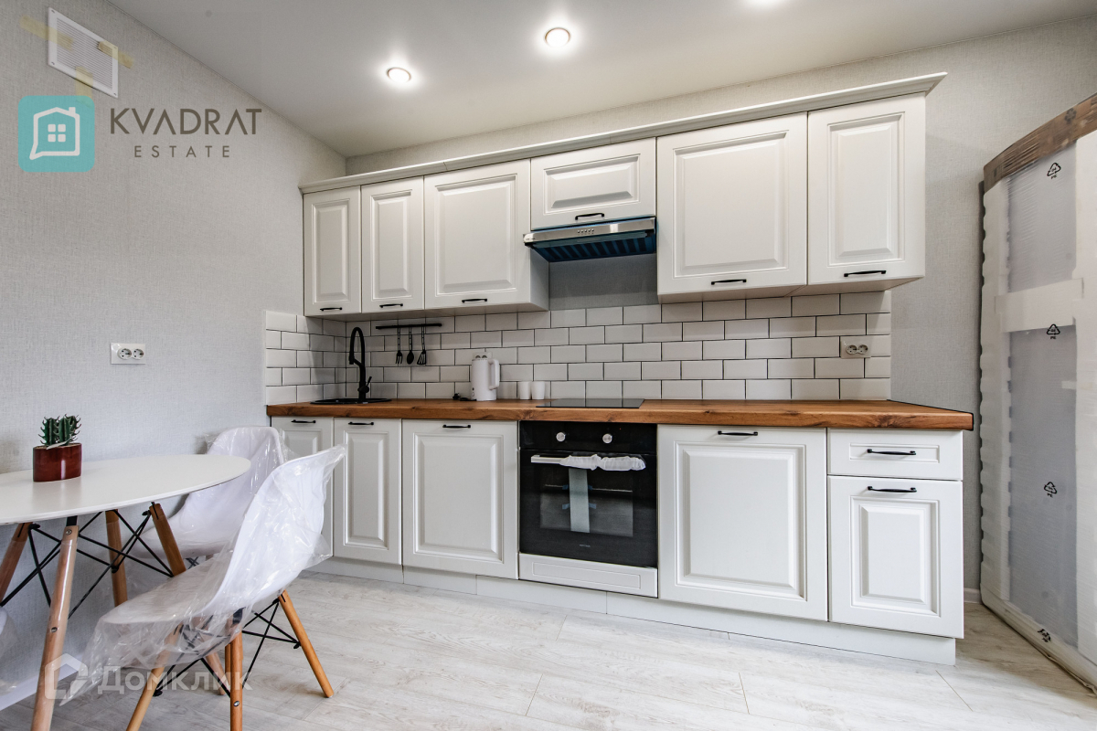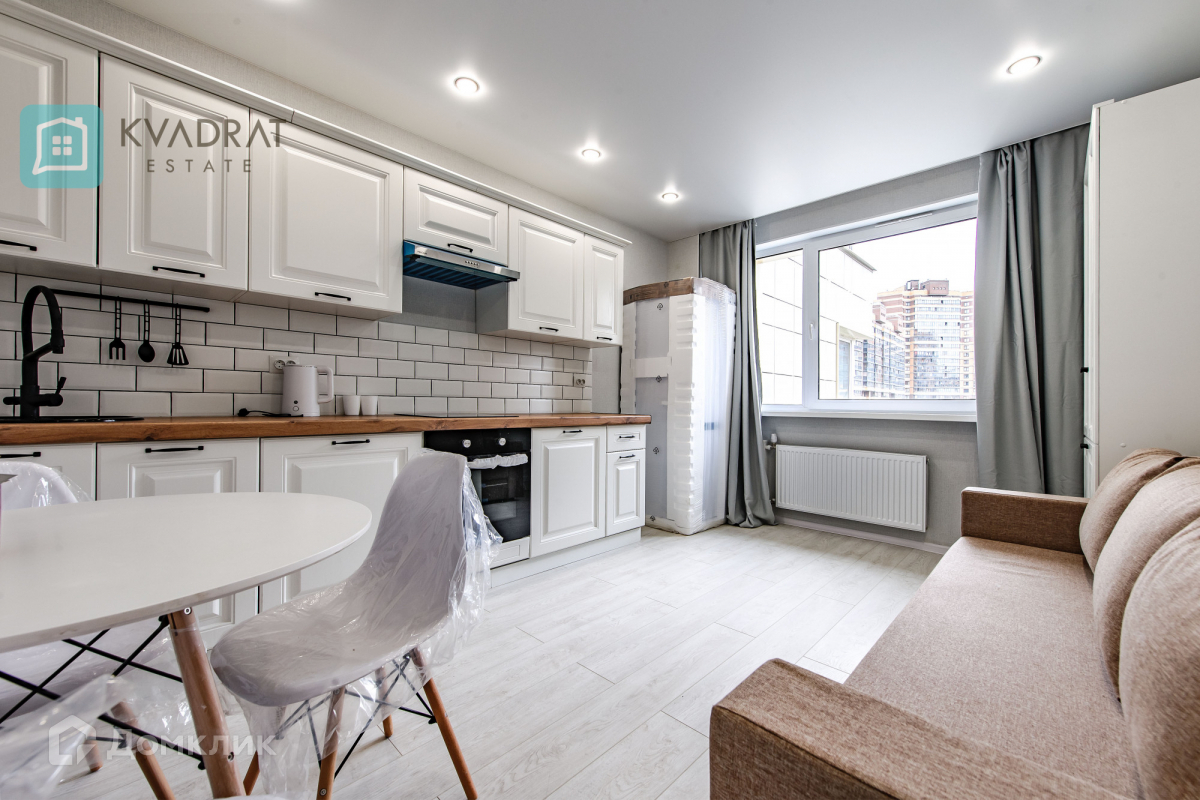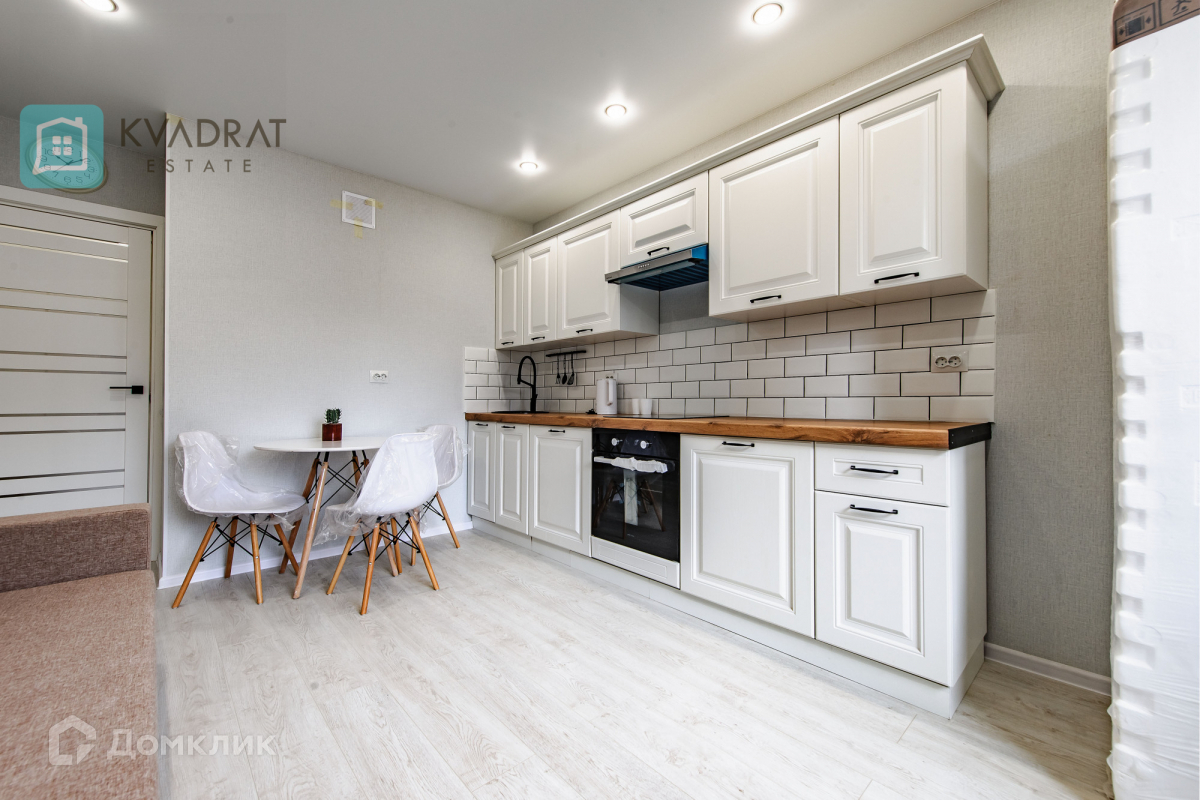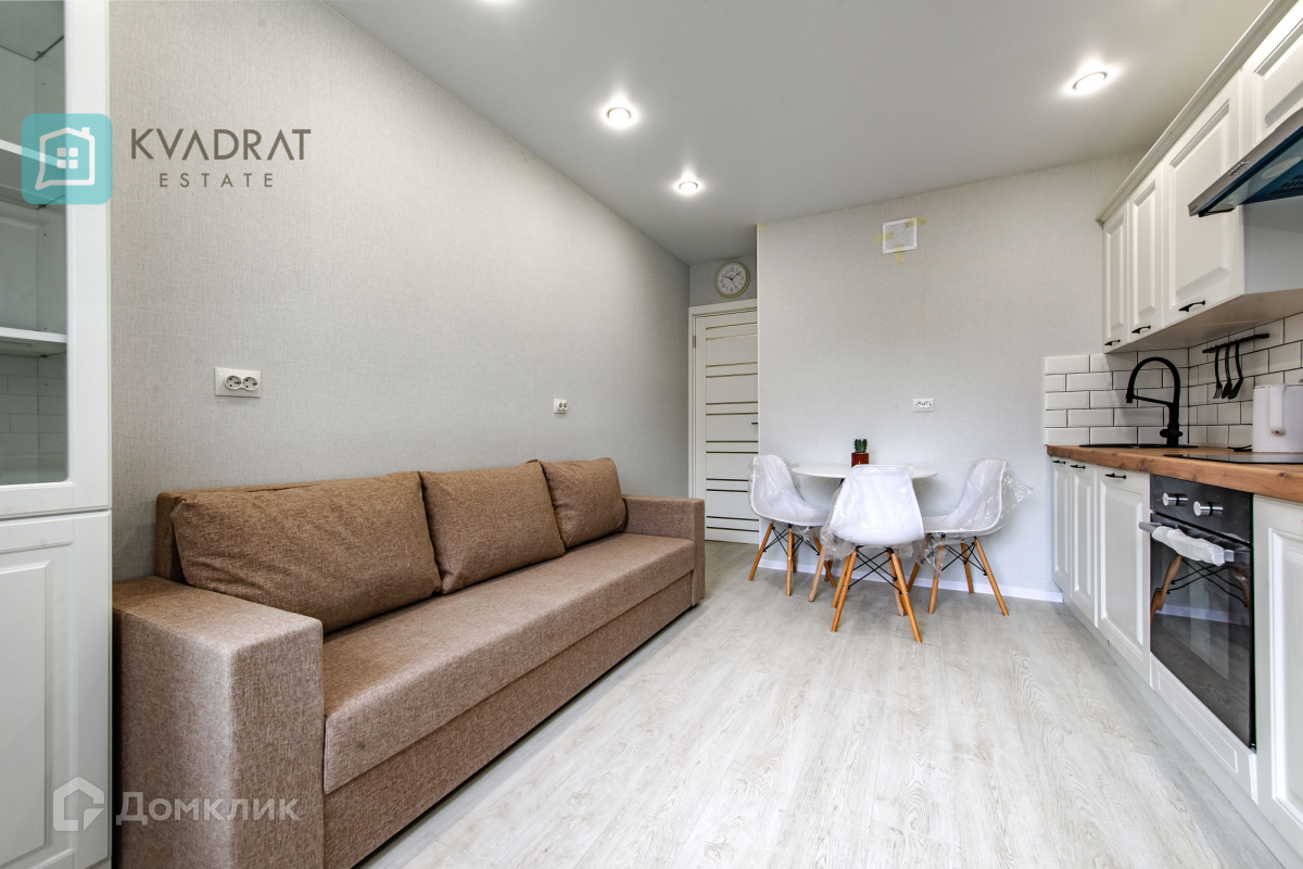 Кухня 15 кв. м. Комнаты 17 + 18 кв. м. В квартире выполнен новый ремонт: напольное покрытие в коридоре - плитка, в комнатах, кухне – ламинат (33 класс), во всех помещениях установлены натяжные потолки. Квартира полностью оснащена мебелью и техникой, которая остаётся покупателю: кухонный гарнитур с бытовой техникой, стиральная машина, шкафы купе, диван, двуспальная кровать, комоды, столы и стулья.