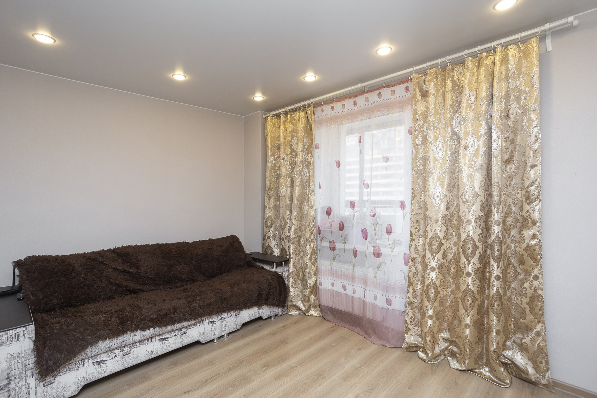 Студия правильной  квадратной формы, есть ниша для холодильника.   Ванна. Большая застекленная лоджия со светом. Натяжные потолки.  Хороший ремонт, ни от застройщика.