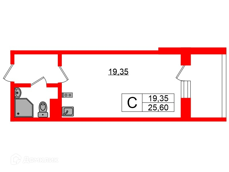 Общая площадь 25.6 м2