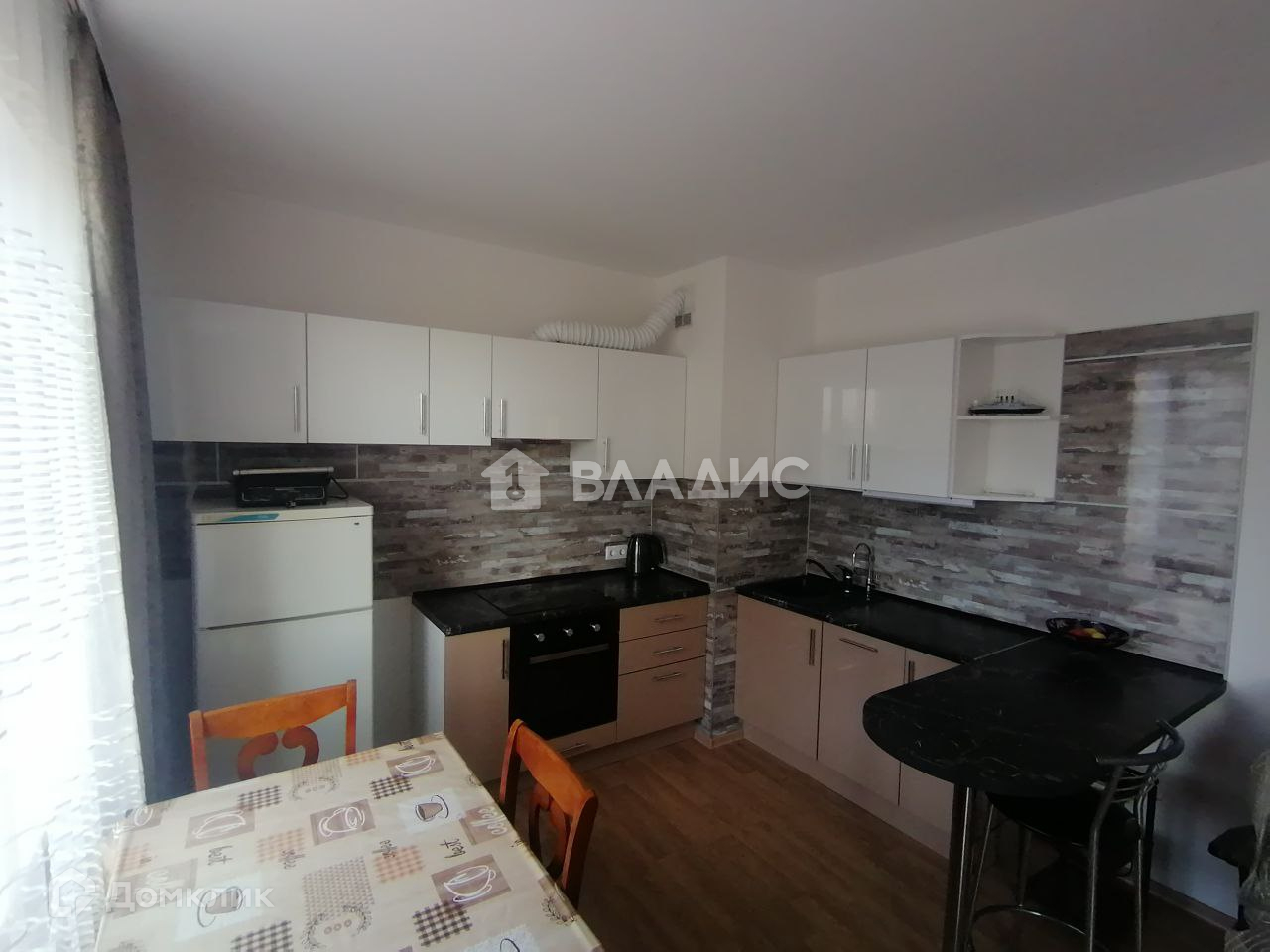 Кухня оборудована встроенным кухонным гарнитуром с барной стойкой и бытовой техникой: варочная панель на 4 конфорки, духовой шкаф, вытяжка, мойка.